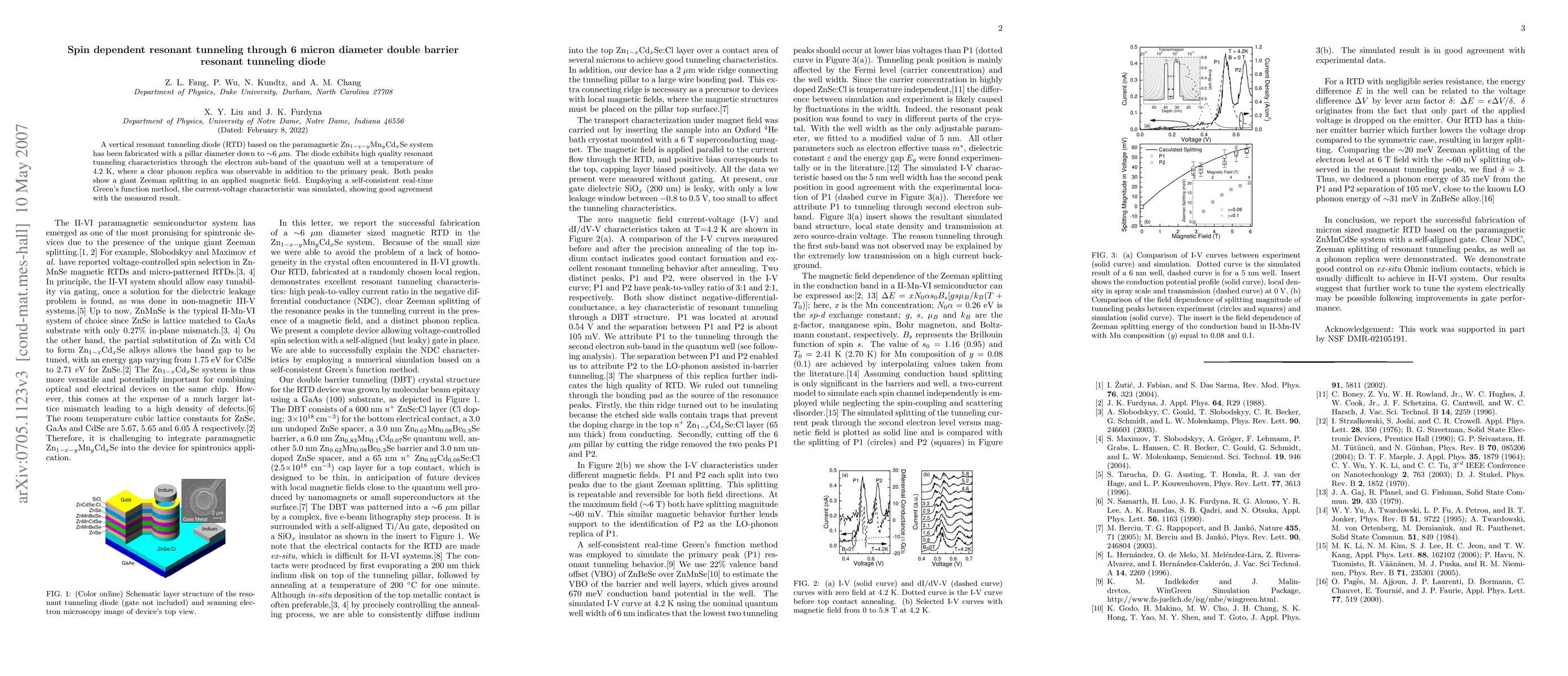 This paper reports on a Zn1-x-yMnyCdxSe-based double barrier resonant tunneling diode with a 6 micron diameter, demonstrating high-quality resonant tunneling at 4.2K, with both peaks showing significant Zeeman splitting under a magnetic field. Simulation using a self-consistent Green's function method aligns well with experimental measurements.