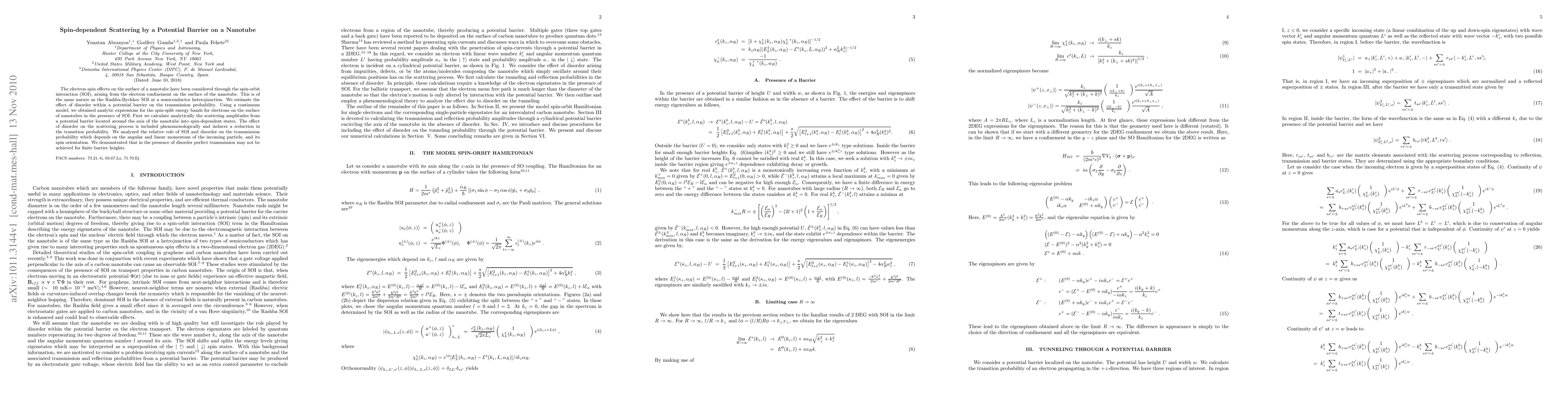 This paper investigates electron spin effects on a nanotube's surface via spin-orbit interaction, estimating the impact of disorder within a potential barrier on transmission probability. The study reveals that disorder reduces the transition probability and perfect transmission may not occur for finite barrier heights, depending on the angular and linear momentum, and spin orientation of the incoming electrons.