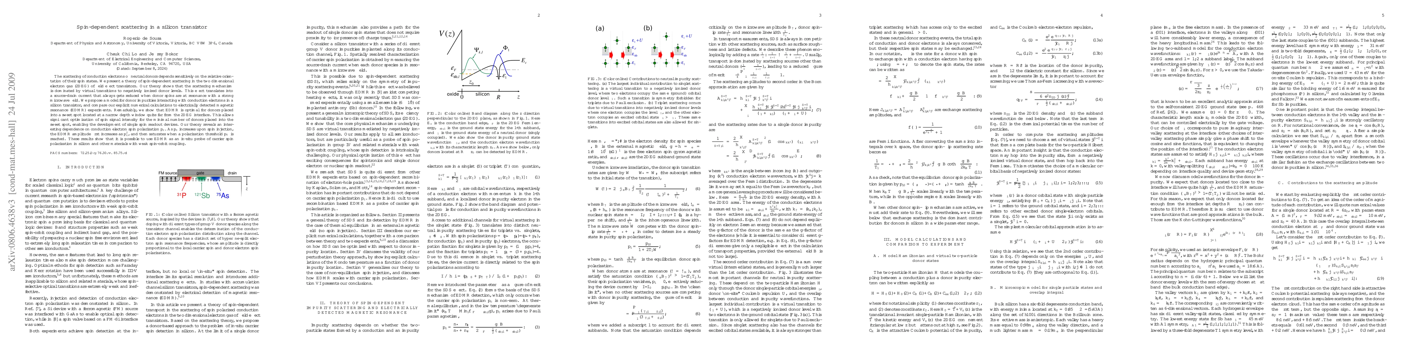 The scattering of conduction electrons off neutral donors depends sensitively on the relative orientation of their spin states. We present a theory of spin-dependent scattering in the two dimensional electron gas (2DEG) of field effect transistors. Our theory shows that the scattering mechanism is dominated by virtual transitions to negatively ionized donor levels. This effect translates into a source-drain current that always gets reduced when donor spins are at resonance with a strong microwave field. We propose a model for donor impurities interacting with conduction electrons in a silicon transistor, and compare our explicit numerical calculations to electrically detected magnetic resonance (EDMR) experiments. Remarkably, we show that EDMR is optimal for donors placed into a sweet spot located at a narrow depth window quite far from the 2DEG interface. This allows significant optimization of spin signal intensity for the minimal number of donors placed into the sweet spot, enabling the development of single spin readout devices. Our theory reveals an interesting dependence on conduction electron spin polarization p_c. As p_c increases upon spin injection, the EDMR amplitude first increases as p_{c}^{2}, and then saturates when a polarization threshold p_T is reached. These results show that it is possible to use EDMR as an in-situ probe of carrier spin polarization in silicon and other materials with weak spin-orbit coupling.