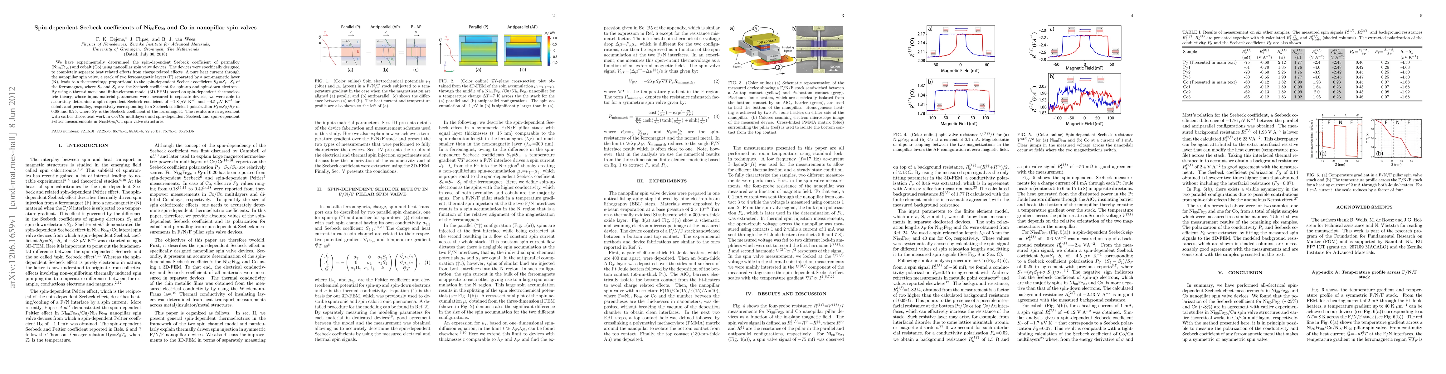 This study experimentally measures the spin-dependent Seebeck coefficients of permalloy and cobalt in nanopillar spin valves, achieving values of -4.5 microvolt/Kelvin and -1.8 microvolt/Kelvin, respectively, and confirming theoretical predictions. The results show a Seebeck coefficient polarization of 0.25 for permalloy and 0.08 for cobalt.
