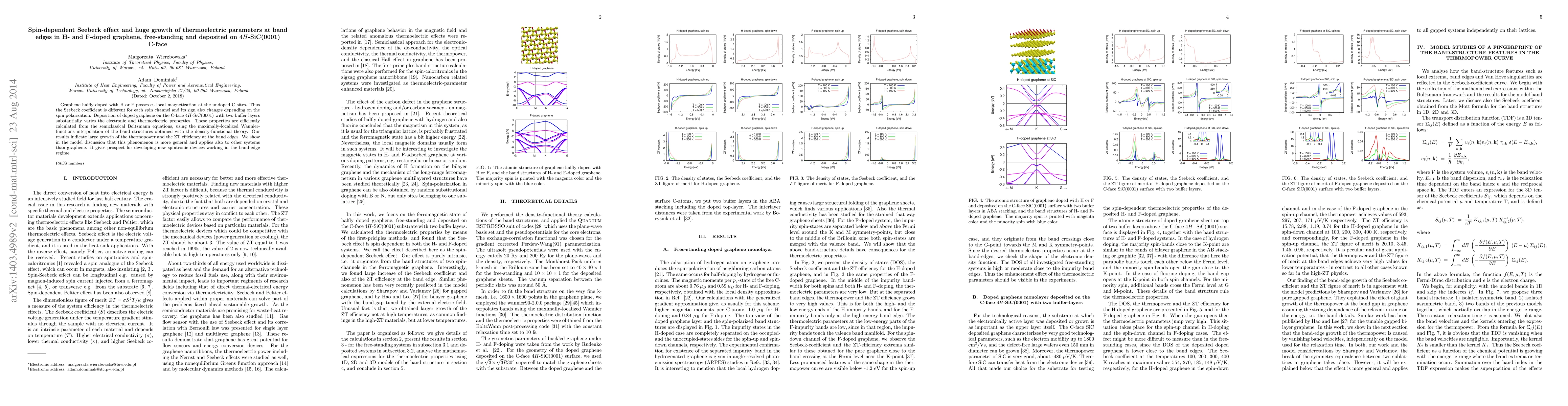 Graphene halfly doped with H or F possesses local magnetization at the undoped C sites. Thus the Seebeck coefficient is different for each spin channel and its sign also changes depending on the spin polarization. Deposition of doped graphene on the C-face 4H-SiC(0001) with two buffer layers substantially varies the electronic and thermoelectric properties. These properties are efficiently calculated from the semiclassical Boltzmann equations, using the maximally-localized Wannier-functions interpolation of the band structures obtained with the density-functional theory. Our results indicate large growth of the thermopower and the ZT efficiency at the band edges. We show in the model discussion that this phenomenon is more general and applies also to other systems than graphene. It gives prospect for developing new spintronic devices working in the band-edge regime.