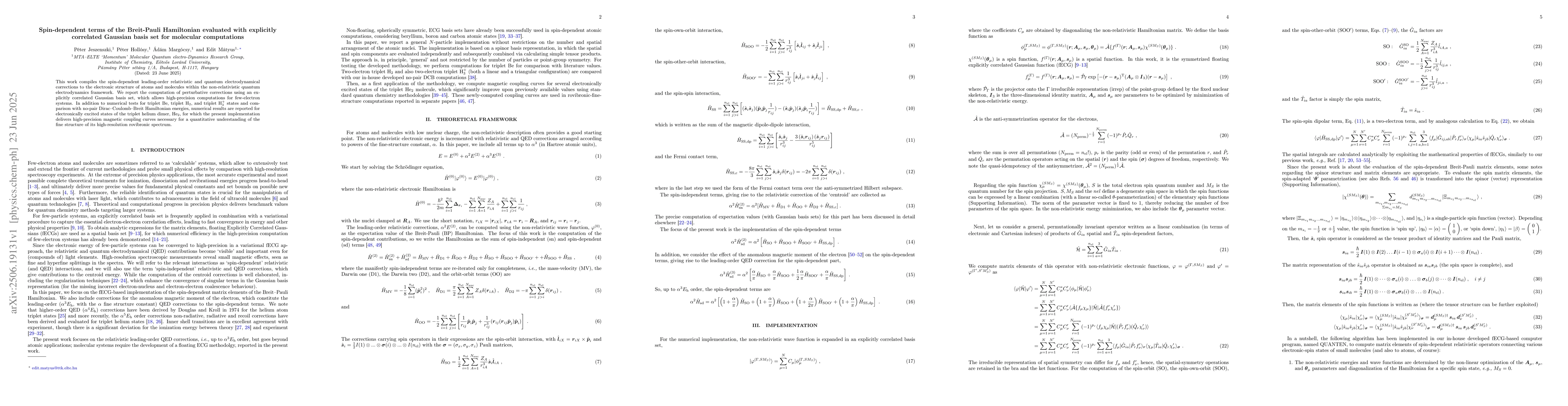 This work compiles the spin-dependent leading-order relativistic and quantum electrodynamical corrections to the electronic structure of atoms and molecules within the non-relativistic quantum electrodynamics framework. We report the computation of perturbative corrections using an explicitly correlated Gaussian basis set, which allows high-precision computations for few-electron systems. In addition to numerical tests for triplet Be, triplet H$_2$, and triplet H$_3^+$ states and comparison with no-pair Dirac-Coulomb-Breit Hamiltonian energies, numerical results are reported for electronically excited states of the triplet helium dimer, He$_2$, for which the present implementation delivers high-precision magnetic coupling curves necessary for a quantitative understanding of the fine structure of its high-resolution rovibronic spectrum.
