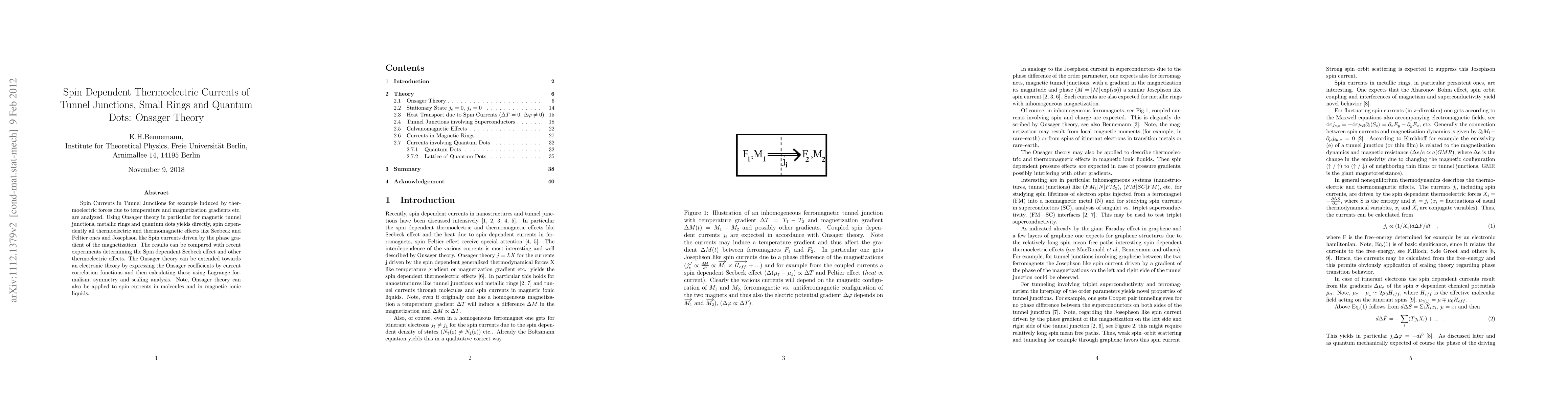 Spin Currents in Tunnel Junctions for example induced by thermoelectric forces due to temperature and magnetization gradients etc. are analyzed. Using Onsager theory yields directly, in particular for magnetic tunnel junctions, metallic rings and quantum dots, spin dependently all thermoelectric and thermomagnetic effects like Seebeck and Peltier ones and Josephson like Spin currents driven by the phase gradient of the magnetization. The results can be compared with recent experiments determining the Spin dependent Seebeck effect and other thermoelectric effects. The Onsager theory can be extended towards an electronic theory by expressing the Onsager coefficients by current correlation functions and then calculating these using Lagrange formalism, symmetry and scaling analysis. Note, Onsager theory can also be applied to spin currents in molecules and in magnetic ionic liquids.