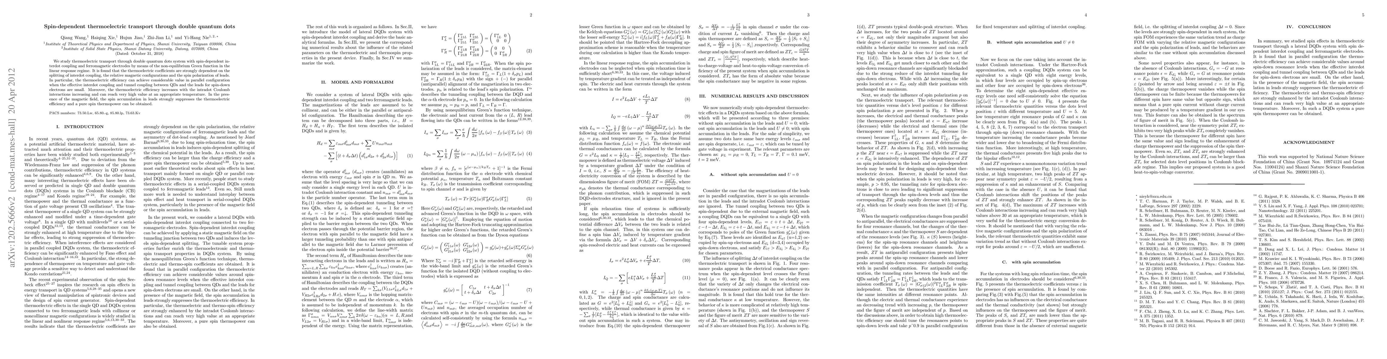 This paper explores thermoelectric transport in a double quantum dot system with spin-dependent interdot coupling and ferromagnetic electrodes, revealing that thermoelectric efficiency depends on interdot coupling, magnetic configurations, and spin polarization. The efficiency peaks in parallel configurations with minimal spin-down electron coupling and increases with stronger Coulomb interactions.
