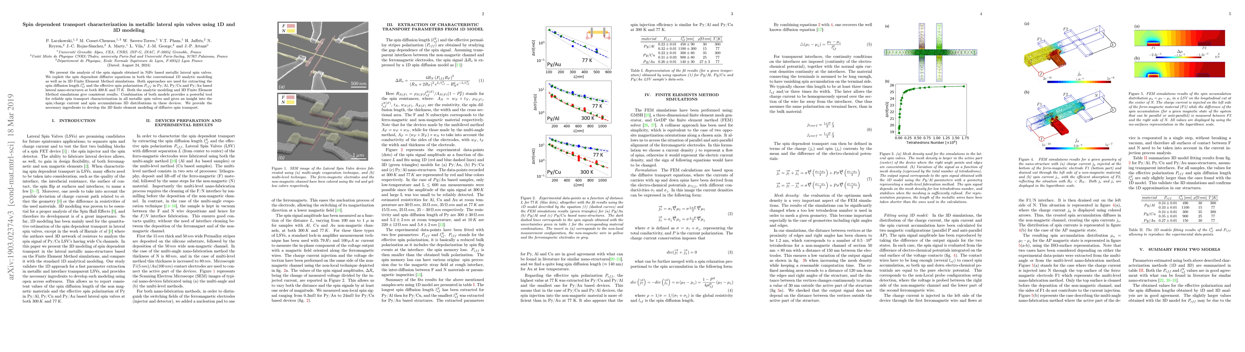 This paper analyzes spin signals in NiFe-based metallic lateral spin valves using both 1D analytical modeling and 3D Finite Element Method simulations to determine spin diffusion length and effective spin polarization in Py/Al, Py/Cu, and Py/Au structures at 300K and 77K. Both modeling approaches yield consistent results, offering a comprehensive tool for spin transport characterization and insight into spin/charge current distributions.
