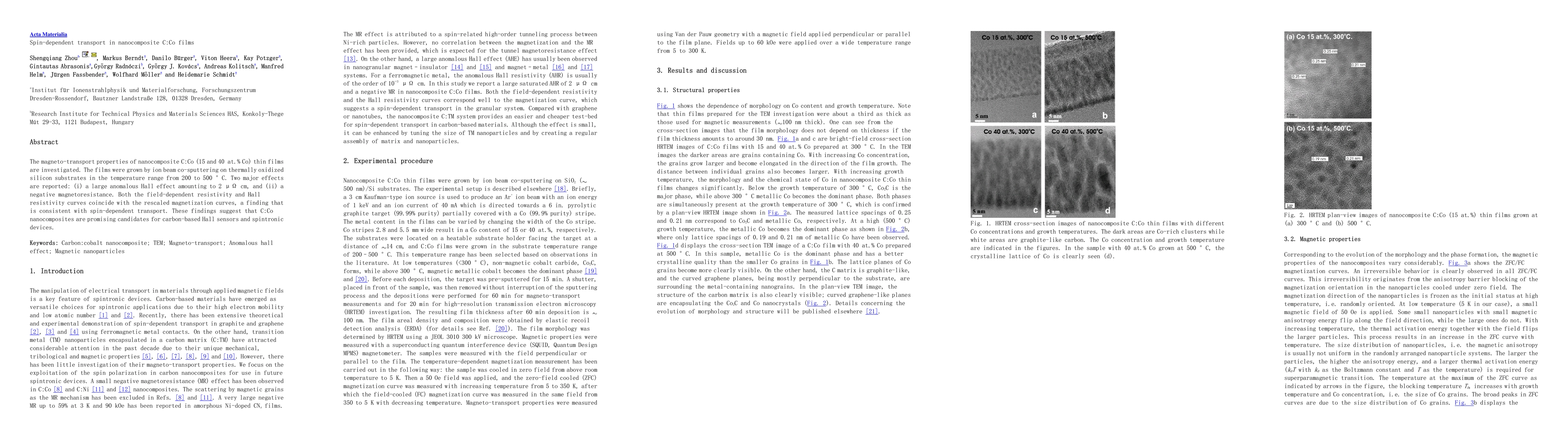 This study investigates the magneto-transport properties of C:Co nanocomposite films with 15 and 40 at.% Co, revealing a large anomalous Hall effect and negative magnetoresistance, indicative of spin-dependent transport, suggesting potential for carbon-based Hall sensors and spintronic applications.