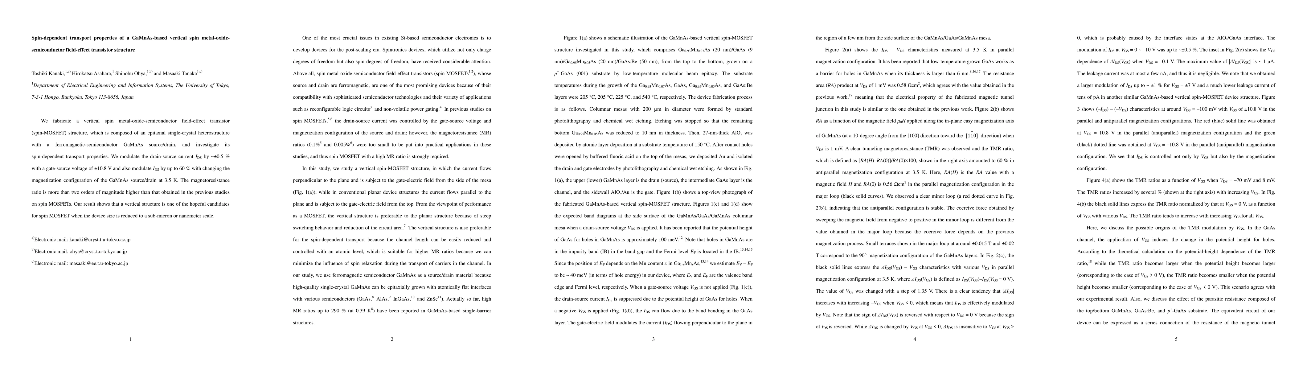 This work is novel in that it employs a vertical spin MOSFET structure with an epitaxial single-crystal heterostructure, which is composed of GaMnAs source/drain, and investigates its spin-dependent transport properties.