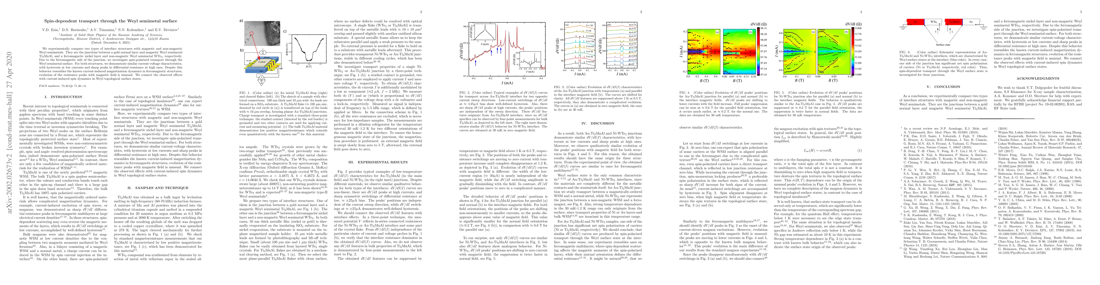 We experimentally compare two types of interface structures with magnetic and non-magnetic Weyl semimetals. They are the junctions between a gold normal layer and magnetic Weyl semimetal Ti$_2$MnAl, and a ferromagnetic nickel layer and non-magnetic Weyl semimetal WTe$_2$, respectively. Due to the ferromagnetic side of the junction, we investigate spin-polarized transport through the Weyl semimetal surface. For both structures, we demonstrate similar current-voltage characteristics, with hysteresis at low currents and sharp peaks in differential resistance at high ones. Despite this behavior resembles the known current-induced magnetization dynamics in ferromagnetic structures, evolution of the resistance peaks with magnetic field is unusual. We connect the observed effects with current-induced spin dynamics in Weyl topological surface states.