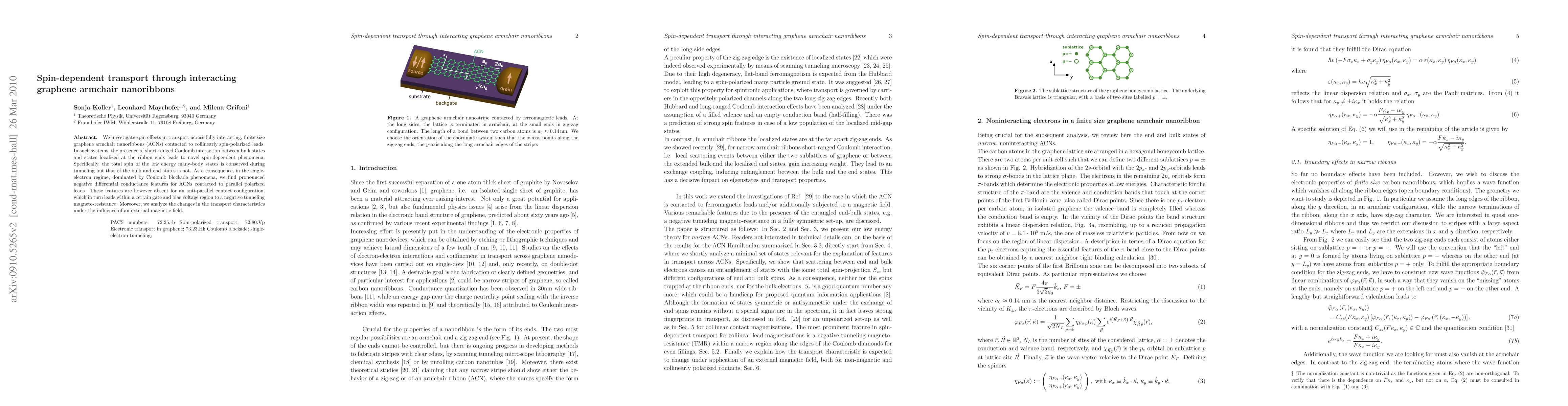 This paper explores spin-dependent transport in graphene armchair nanoribbons, revealing that Coulomb interactions cause distinct spin-dependent phenomena. It finds pronounced negative differential conductance in parallel spin-polarized leads and negative tunneling magneto-resistance in anti-parallel configurations, with transport characteristics also influenced by magnetic fields.