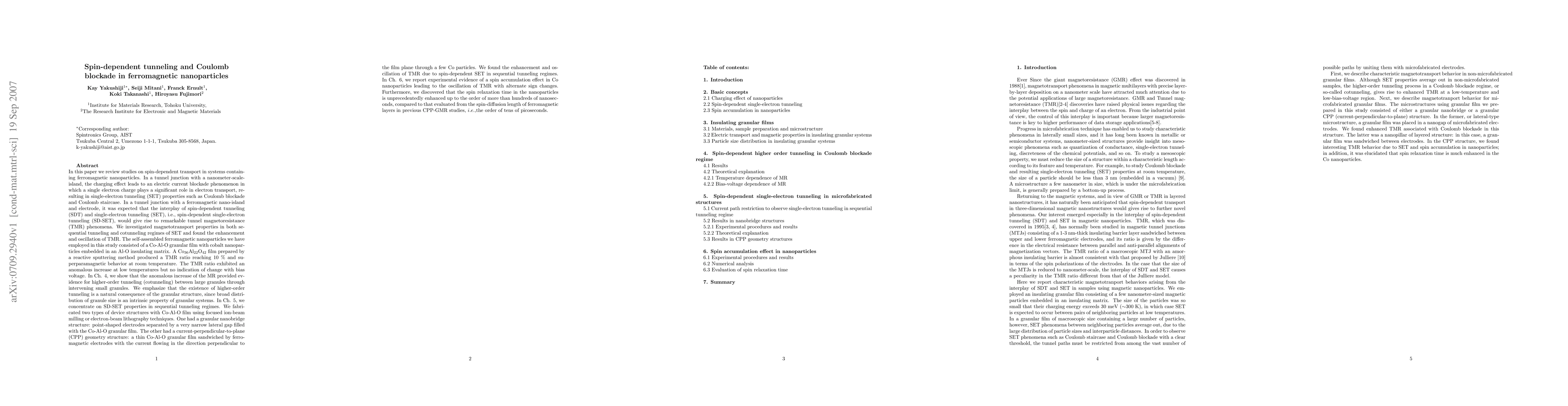 This paper reviews spin-dependent tunneling in ferromagnetic nanoparticles, focusing on preparation methods and mechanisms of spin-dependent transport. It highlights enhanced tunnel magnetoresistance due to co-tunneling in the Coulomb blockade regime and TMR sign changes from spin accumulation.