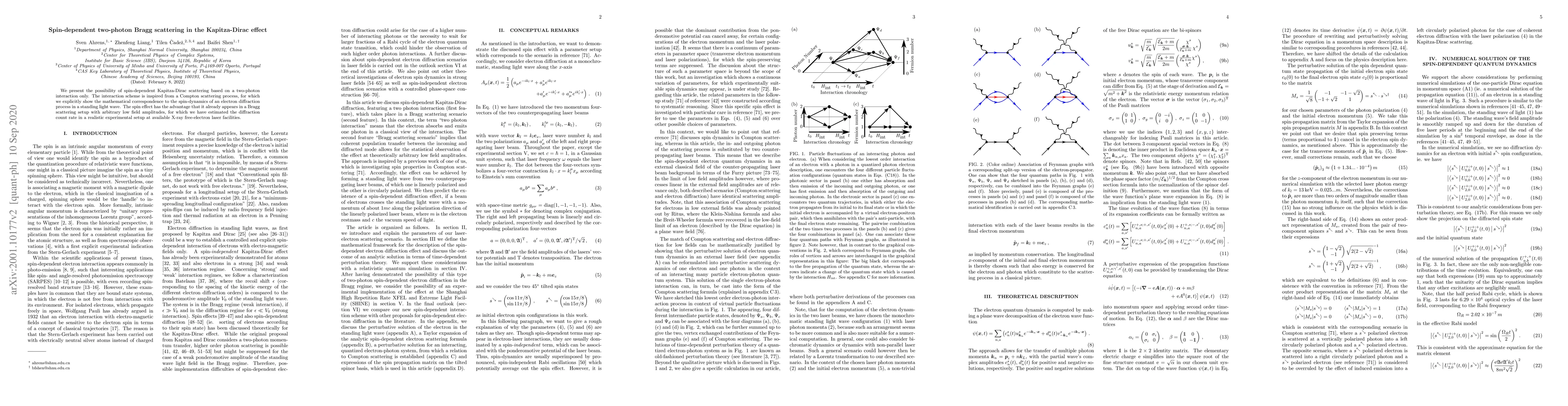 We present the possibility of spin-dependent Kapitza-Dirac scattering based on a two-photon interaction only. The interaction scheme is inspired from a Compton scattering process, for which we explicitly show the mathematical correspondence to the spin-dynamics of an electron diffraction process in a standing light wave. The spin effect has the advantage that it already appears in a Bragg scattering setup with arbitrary low field amplitudes, for which we have estimated the diffraction count rate in a realistic experimental setup at available X-ray free-electron laser facilities.