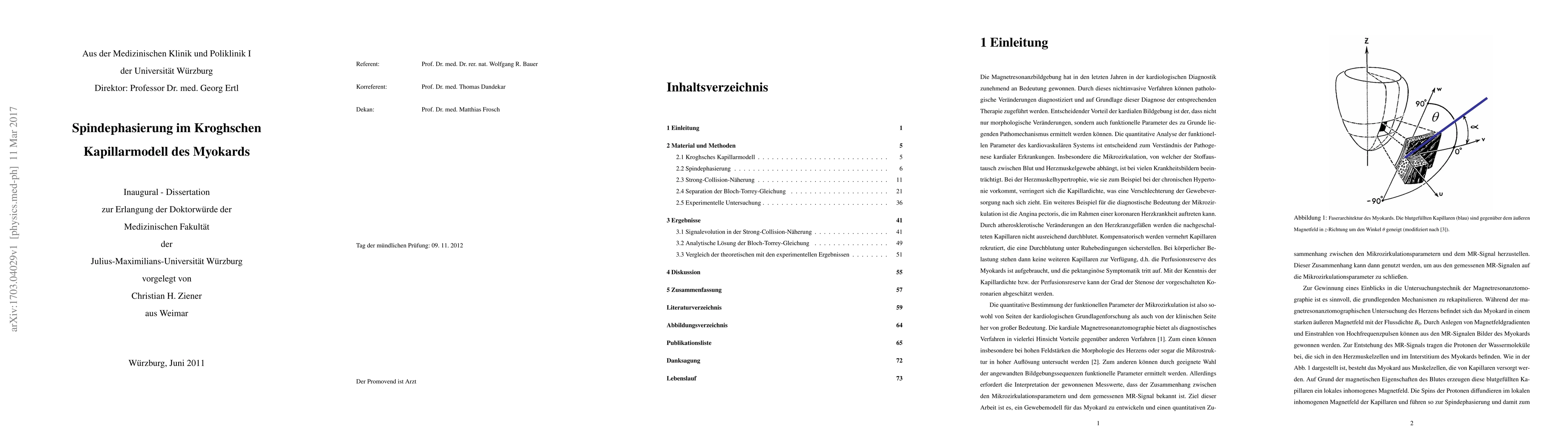 The relation between the parameters of the microscopic structure of the myocardium and the spin dephasing is analyzed. The microscopic structure of the myocardium is described in terms of Krogh's capillary model. In this model the myocardium is reduced to a single capillary which is surrounded by a concentric tissue cylinder. In the tissue cylinder the dephasing and diffusion process occurs. Mathematically the dephasing process is described by the Bloch-Torrey-equation. Experimentally the Signal-time-decay was measured using a PRESS-sequence and a gradient-echo-sequence. Using the methods provided in this work, the relation between the capillary radius and the measured free induction decay can be given.