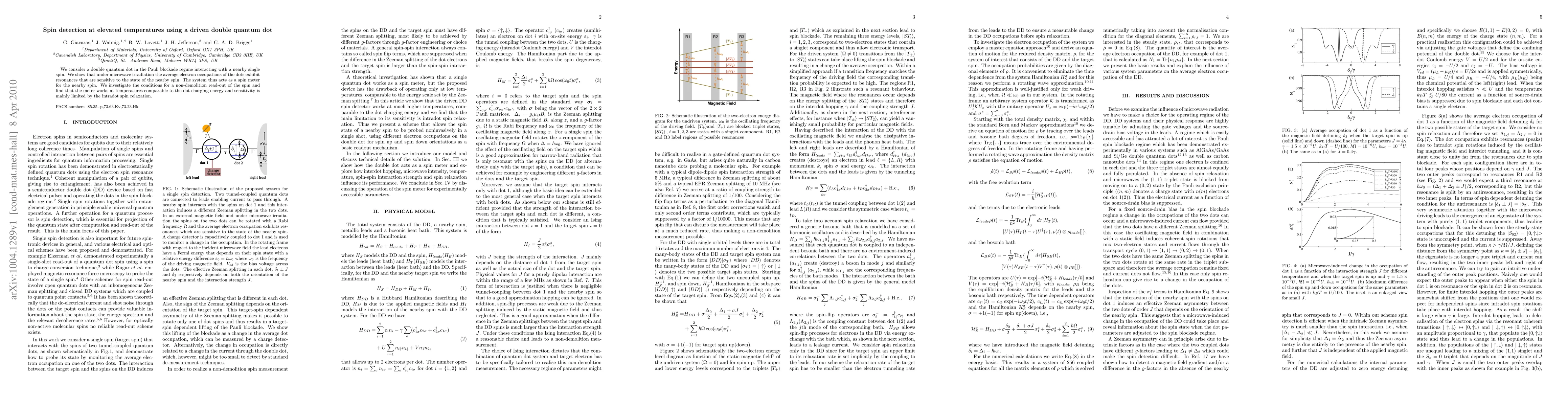 This research presents a method using a double quantum dot system to detect the state of a nearby single spin at temperatures near the dot charging energy. The system's average electron occupations show resonances under microwave irradiation, sensitive to the spin state, enabling non-destructive spin readout. The sensitivity is primarily determined by intradot spin relaxation.