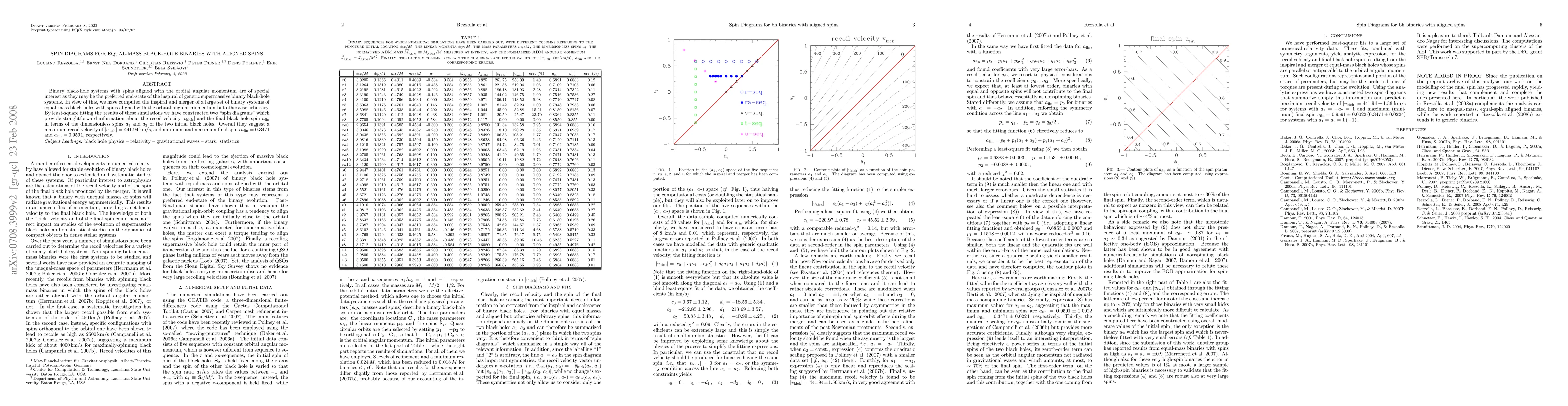 This paper investigates binary black-hole systems with aligned spins and computes their inspiral and merger, constructing two "spin diagrams" that provide insights into the recoil velocity and final black-hole spin in terms of initial spin parameters. The findings suggest a maximum recoil velocity of 441.94 km/s and a range of final spins from 0.3471 to 0.9591.