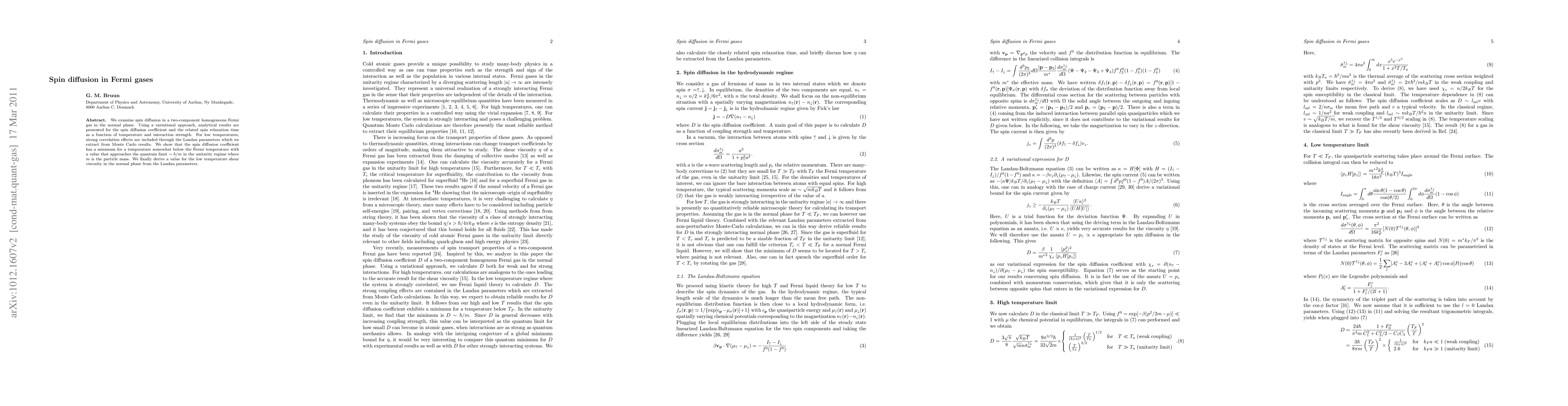 This paper investigates spin diffusion in a homogeneous Fermi gas, revealing a minimum spin diffusion coefficient below the Fermi temperature, approaching the quantum limit in the unitarity regime. Analytical results for the spin diffusion coefficient and relaxation time are derived, incorporating strong correlation effects via Landau parameters from Monte Carlo simulations.