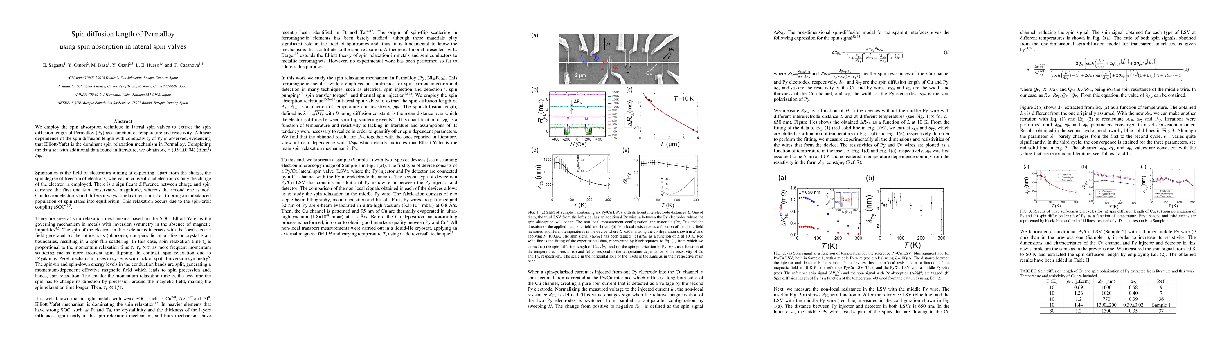 This study uses spin absorption in lateral spin valves to determine the spin diffusion length of Permalloy as a function of temperature and resistivity. The linear relationship between spin diffusion length and conductivity indicates that Elliott-Yafet mechanism dominates spin relaxation in Permalloy, with a derived formula $\lambda_{Py}= (0.91\pm 0.04) (f\Omega m^2)/\rho_{Py}$.
