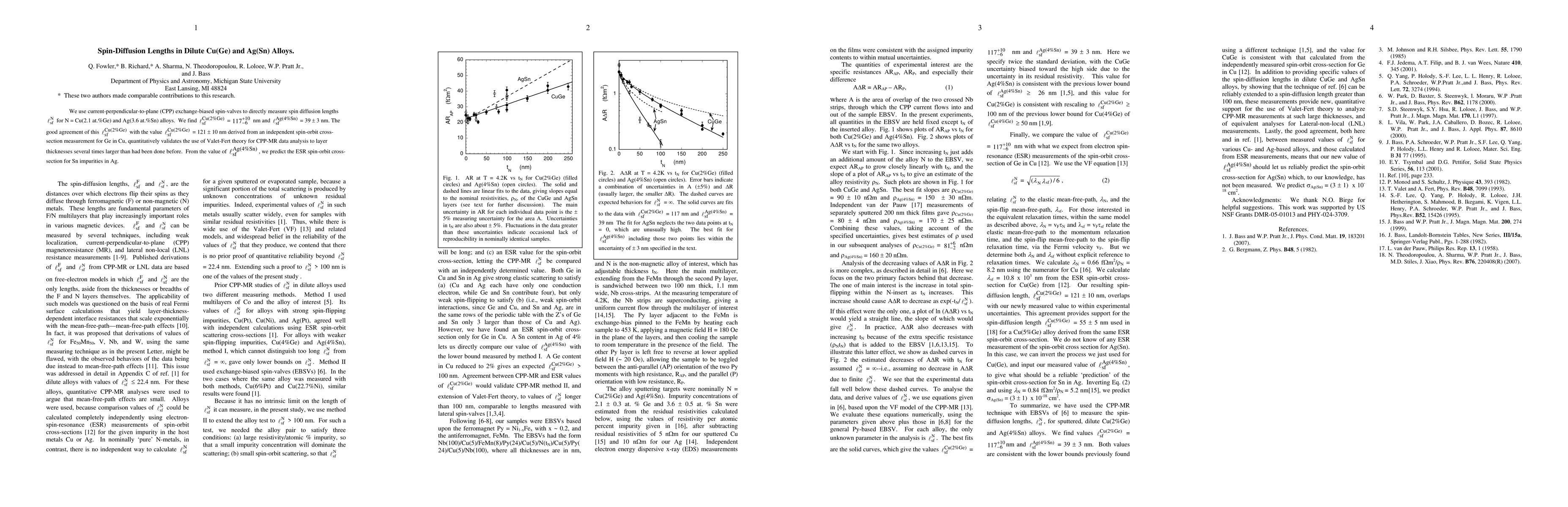 This paper measures spin diffusion lengths in dilute Cu(2.1 at.%Ge) and Ag(3.6 at.%Sn) alloys using CPP exchange-biased spin-valves, finding lsf(Cu2%Ge) = 117±6 nm and lsf(Ag4%Sn) = 39±3 nm. The agreement between these values and prior measurements validates the application of Valet-Fert theory for spin-diffusion analysis.