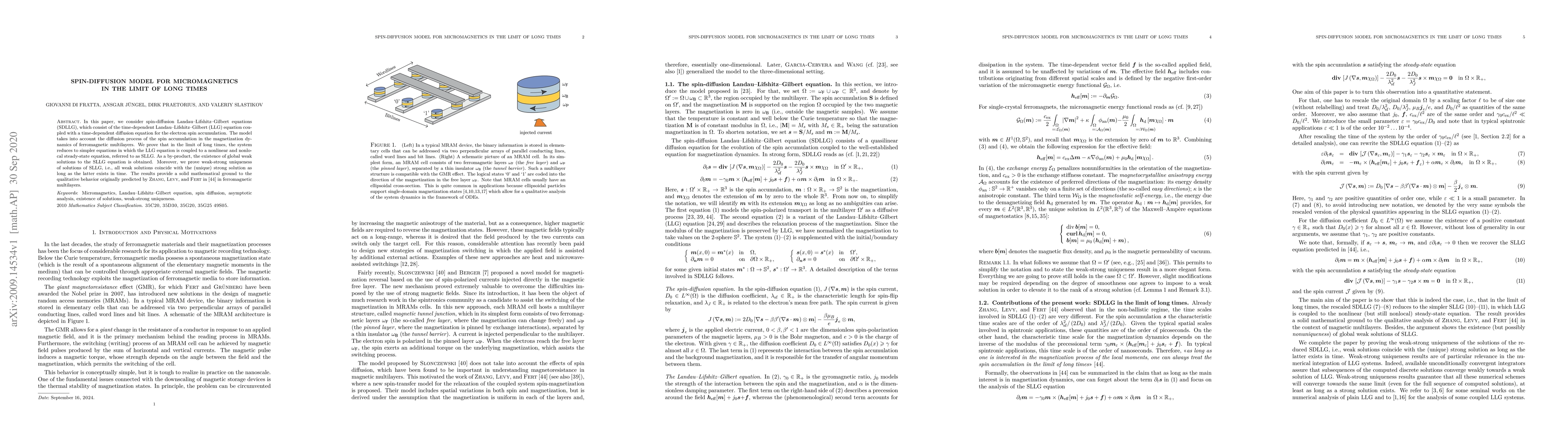 Researchers developed a spin-diffusion model for micromagnetics in long-time limits, simplifying complex equations to study ferromagnetic multilayers. They showed that the simplified model predicts unique behavior in these materials, providing mathematical ground for previous predictions.