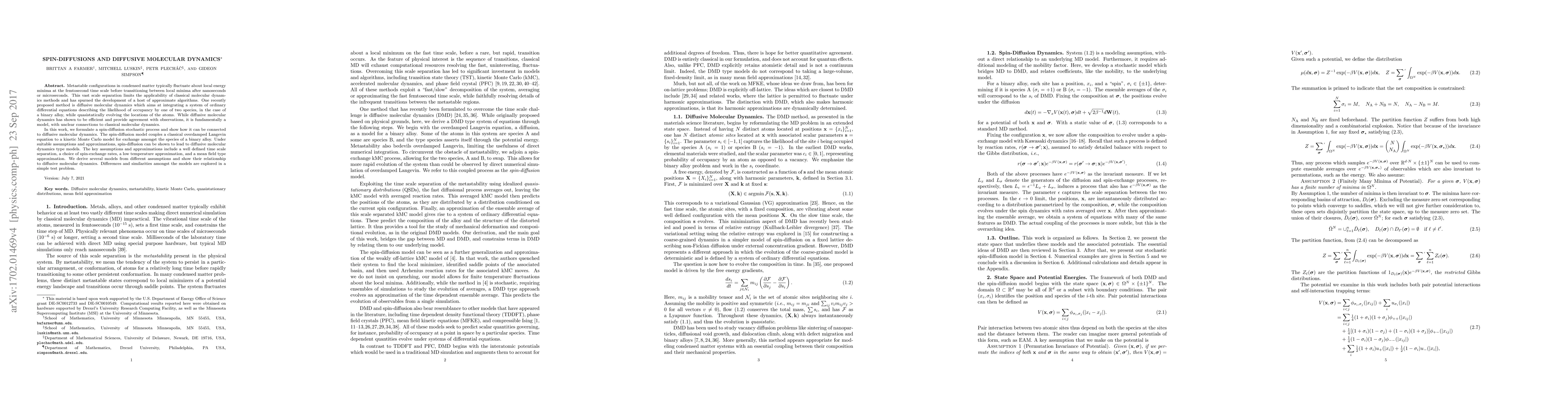 Metastable condensed matter typically fluctuates about local energy minima at the femtosecond time scale before transitioning between local minima after nanoseconds or microseconds. This vast scale separation limits the applicability of classical molecular dynamics methods and has spurned the development of a host of approximate algorithms. One recently proposed method is diffusive molecular dynamics which aims to integrate a system of ordinary differential equations describing the likelihood of occupancy by one of two species, in the case of a binary alloy, while quasistatically evolving the locations of the atoms. While diffusive molecular dynamics has shown to be efficient and provide agreement with observations, it is fundamentally a model, with unclear connections to classical molecular dynamics. In this work, we formulate a spin-diffusion stochastic process and show how it can be connected to diffusive molecular dynamics. The spin-diffusion model couples a classical overdamped Langevin equation to a kinetic Monte Carlo model for exchange amongst the species of a binary alloy. Under suitable assumptions and approximations, spin-diffusion can be shown to lead to diffusive molecular molecular dynamics type models. The key assumptions and approximations include a well defined time scale separation, a choice of spin exchange rates, a low temperature approximation, and a mean field type approximation. We derive several models from different assumptions and show their relationship to diffusive molecular dynamics. Differences and similarities amongst the models are explored in a simple test problem.