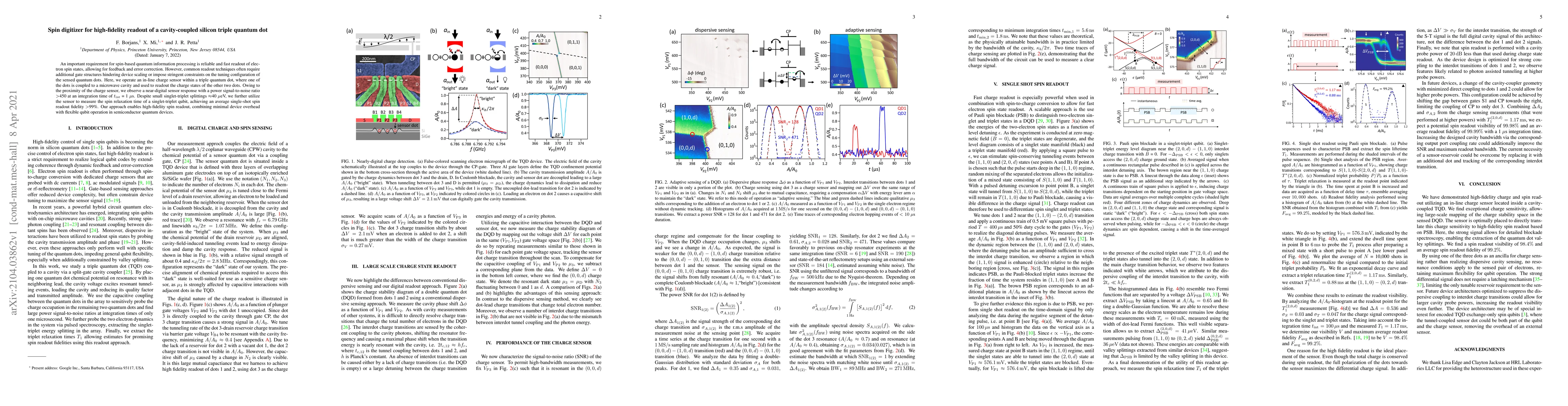 This paper presents a novel spin digitizer utilizing a cavity-coupled silicon triple quantum dot for high-fidelity readout of electron spin states. The method achieves a power signal-to-noise ratio >450 and single-shot spin readout fidelity >99% with minimal device overhead, enabling flexible qubit operation in semiconductor quantum devices.