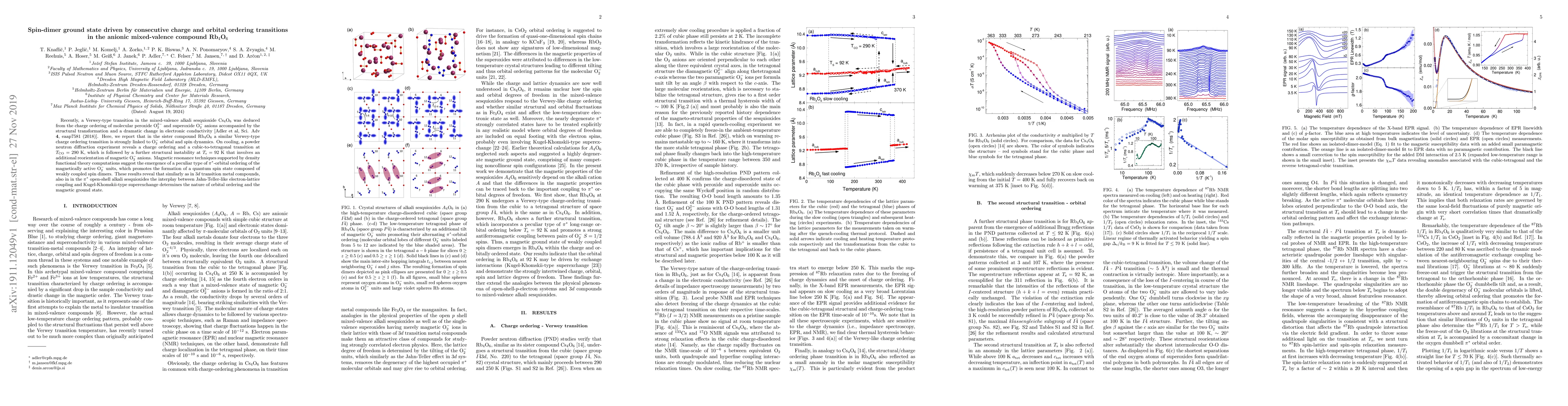 This paper investigates the Verwey-type charge ordering in Rb$_4$O$_6$, revealing a transition linked to O$_2^-$ orbital and spin dynamics, leading to a cubic-to-tetragonal structural change and the formation of spin dimers. The study highlights the role of electron-lattice coupling and superexchange interactions in determining orbital ordering and the magnetic ground state.