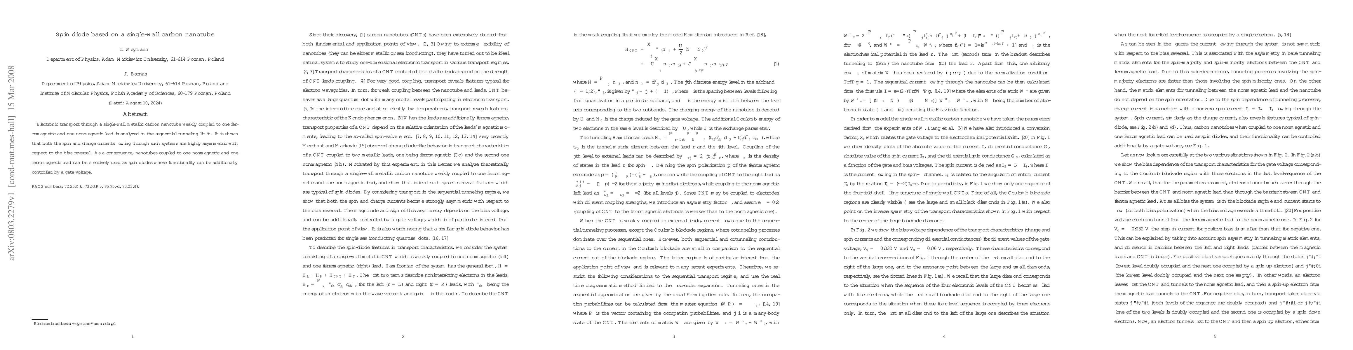Single-wall carbon nanotubes connected to one ferromagnetic and one nonmagnetic lead exhibit highly asymmetric spin and charge currents, making them effective spin diodes. The functionality of these spin diodes can be modulated by applying a gate voltage.