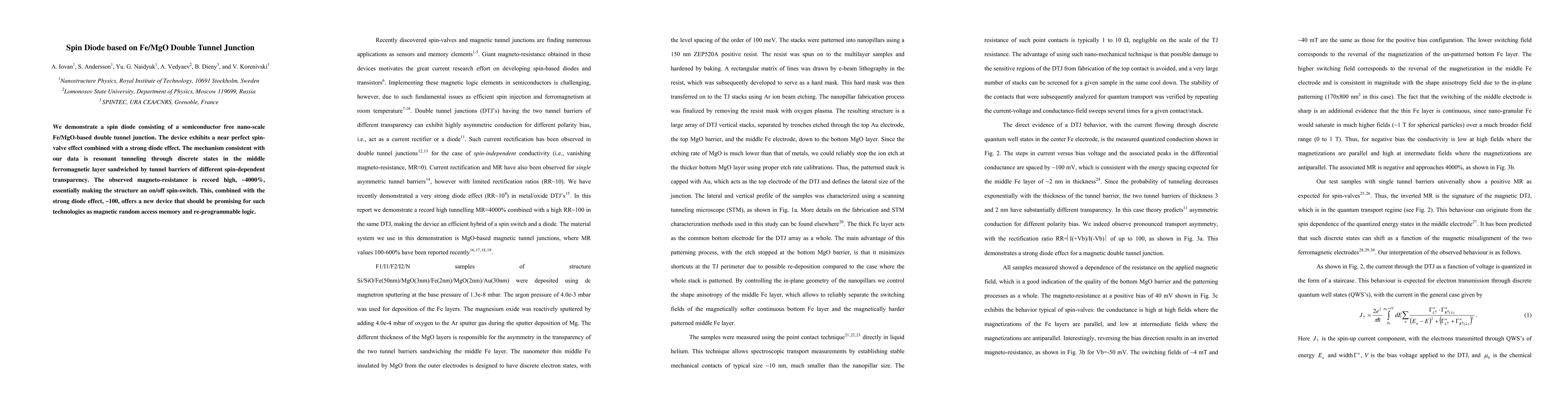 We demonstrate a spin diode consisting of a semiconductor free nano-scale Fe/MgO-based double tunnel junction. The device exhibits a near perfect spin-valve effect combined with a strong diode effect. The mechanism consistent with our data is resonant tunneling through discrete states in the middle ferromagnetic layer sandwiched by tunnel barriers of different spin-dependent transparency. The observed magneto-resistance is record high, ~4000%, essentially making the structure an on/off spin-switch. This, combined with the strong diode effect, ~100, offers a new device that should be promising for such technologies as magnetic random access memory and re-programmable logic.