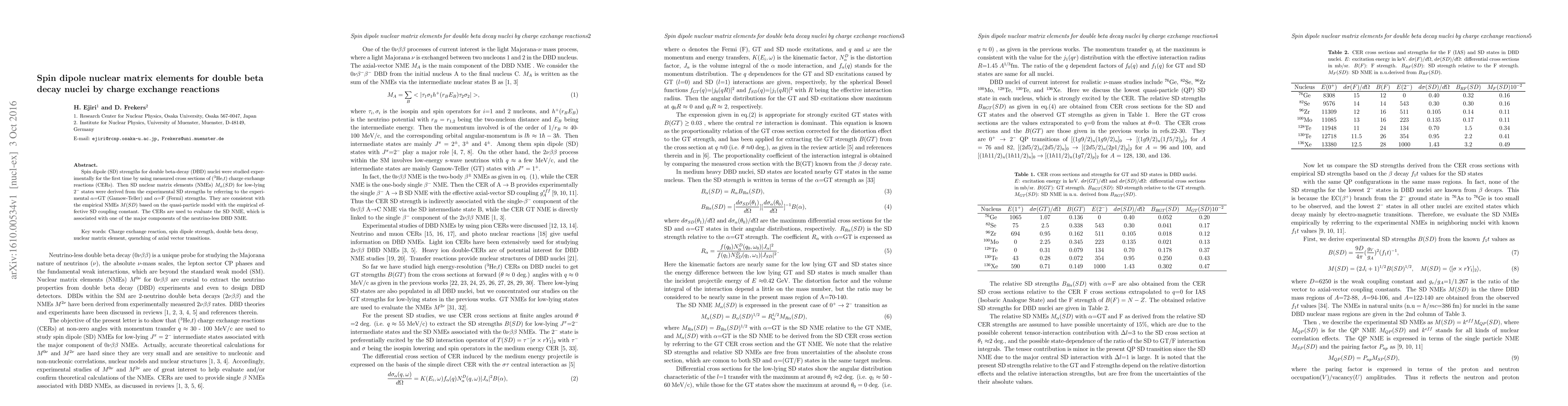 Spin dipole (SD) strengths for double beta-decay (DBD) nuclei were studied experimentally for the first time by using measured cross sections of (3He,t) charge exchange reactions (CERs). Then SD nuclear matrix elements (NMEs) for low-lying 2- states were derived from the experimental SD strengths by referring to the experimental GT (Gamow-Teller) and F (Fermi) strengths. They are consistent with the empirical SD NMEs based on the quasi-particle model with the empirical effective SD coupling constant. The CERs are used to evaluate the SD NME, which is associated with one of the major components of the neutrino-less DBD NME.