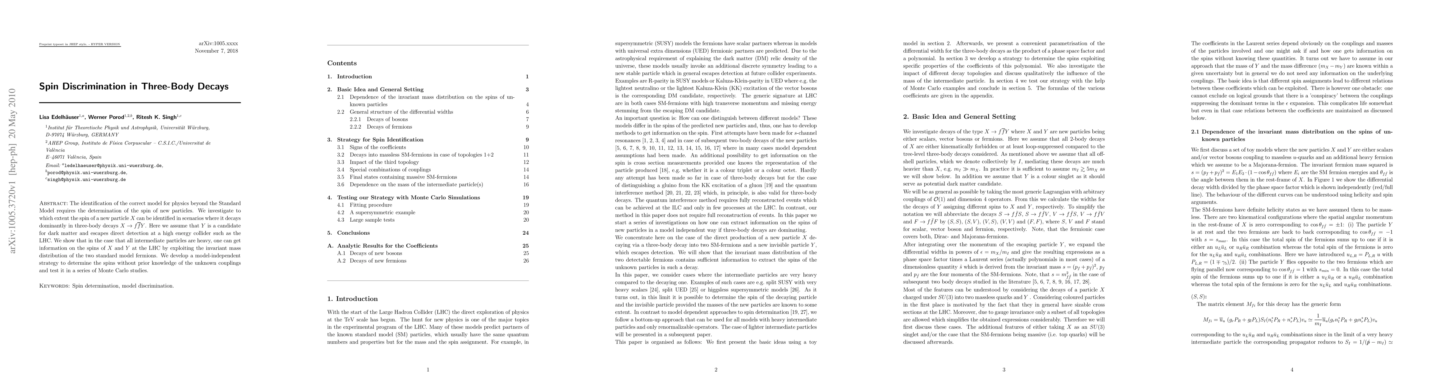 Researchers developed a method to identify the spin of new particles in three-body decays at the LHC by analyzing the invariant mass distribution of decay products, enabling detection of dark matter candidates without prior knowledge of their couplings.