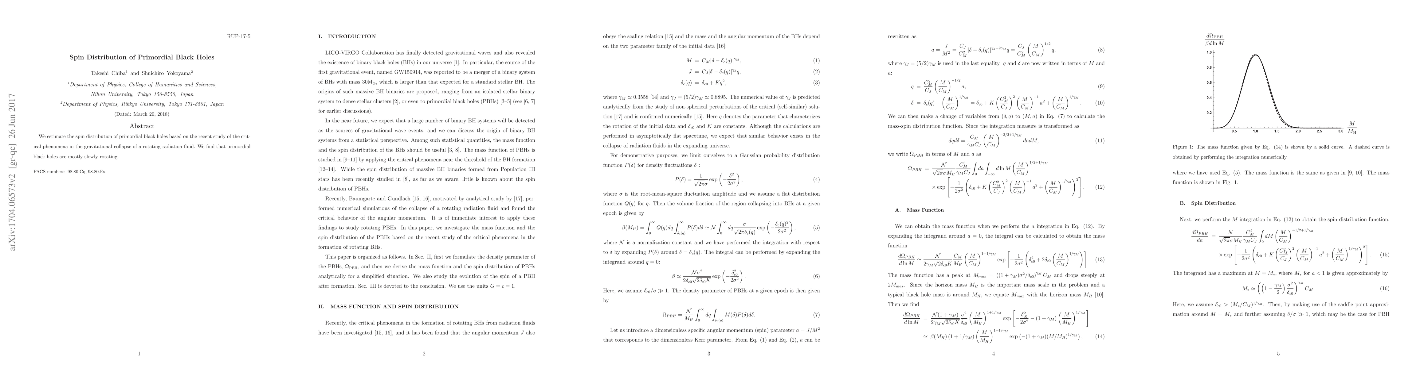 Summary: This study investigates the spin distribution of primordial black holes, concluding that they predominantly exhibit slow rotation based on recent analyses of gravitational collapse in rotating radiation fluids.