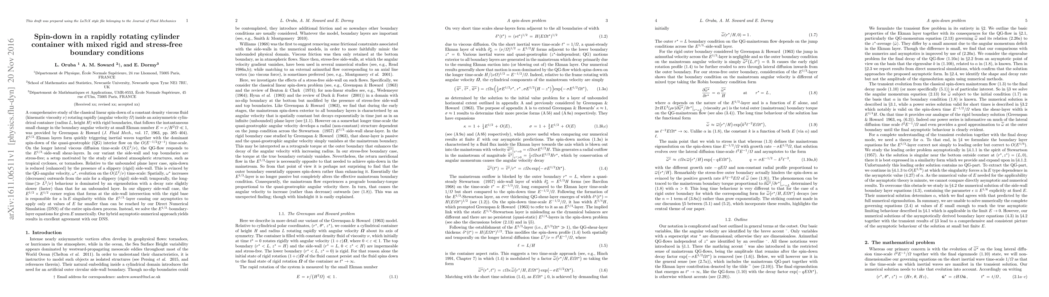 A comprehensive study of the classical linear spin-down of a constant density viscous fluid (kinematic viscosity \nu) rotating rapidly (angular velocity \Omega) inside an axisymmetric cylindrical container (radius L, height H) with rigid boundaries, that follows the instantaneous small change in the boundary angular velocity at small Ekman number $E=\nu/H^2\Omega \ll 1$, was provided by Greenspan & Howard (1963). $E^{1/2}$-Ekman layers form quickly triggering inertial waves together with the dominant spin-down of the quasi-geostrophic (QG) interior flow on the $O(E^{-1/2}\Omega^{-1})$ time-scale. On the longer lateral viscous diffusion time-scale $O(L^2/\nu)$, the QG-flow responds to the $E^{1/3}$-side-wall shear-layers. In our variant the side-wall and top boundaries are stress-free; a setup motivated by the study of isolated atmospheric structures, such as tropical cyclones, or tornadoes. Relative to the unbounded plane layer case, spin-down is reduced (enhanced) by the presence of a slippery (rigid) side-wall. This is evinced by the QG-angular velocity, \omega*, evolution on the O(L^2/\nu) time-scale: Spatially, \omega* increases (decreases) outwards from the axis for a slippery (rigid) side-wall; temporally, the long-time ($\gg L^2/\nu)$ behaviour is dominated by an eigensolution with a decay rate slightly slower (faster) than that for an unbounded layer. In our slippery side-wall case, the $E^{1/2} \times E^{1/2}$ corner region that forms at the side-wall intersection with the rigid base is responsible for a $\ln E$ singularity within the $E^{1/3}$-layer causing our asymptotics to apply only at values of E far smaller than can be reached by our Direct Numerical Simulation (DNS) of the entire spin-down process. Instead, we solve the $E^{1/3}$-boundary-layer equations for given E numerically. Our hybrid asymptotic-numerical approach yields results in excellent agreement with our DNS.