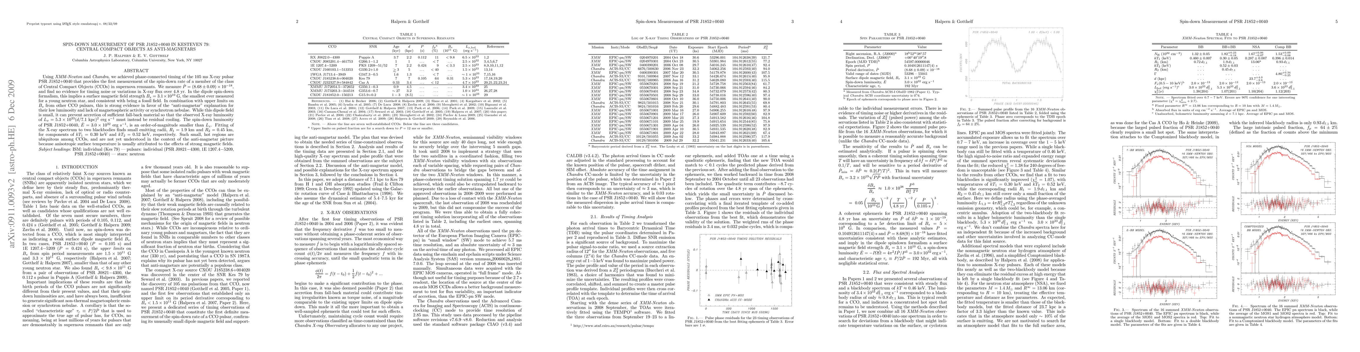 Using XMM-Newton and Chandra, we achieved phase-connected timing of the 105 ms X-ray pulsar PSR J1852+0040 that provides the first measurement of the spin-down rate of a member of the class of Central Compact Objects (CCOs) in supernova remnants. We measure P-dot = 8.68(9)E-18, and find no evidence for timing noise or variations in X-ray flux over 4.8 yr. In the dipole spin-down formalism, this implies a surface magnetic field strength B_s = 3.1E10 G, the smallest ever measured for a young neutron star, and consistent with being a fossil field. In combination with upper limits on B_s from other CCO pulsars, this is strong evidence in favor of the "anti-magnetar" explanation for their low luminosity and lack of magnetospheric activity or synchrotron nebulae. While this dipole field is small, it can prevent accretion of sufficient fall-back material so that the observed X-ray luminosity of L_x = 5.3E33(d/7.1 kpc)^2 erg/s must instead be residual cooling. The spin-down luminosity of PSR J1852+0040, E-dot = 3.0E32 erg/s, is an order-of-magnitude smaller than L_x. Fitting of the X-ray spectrum to two blackbodies finds small emitting radii, R_1 = 1.9 km and R_2 = 0.45 km, for components of kT_1 = 0.30 keV and kT_2 = 0.52 keV, respectively. Such small, hot regions are ubiquitous among CCOs, and are not yet understood in the context of the anti-magnetar picture because anisotropic surface temperature is usually attributed to the effects of strong magnetic fields.