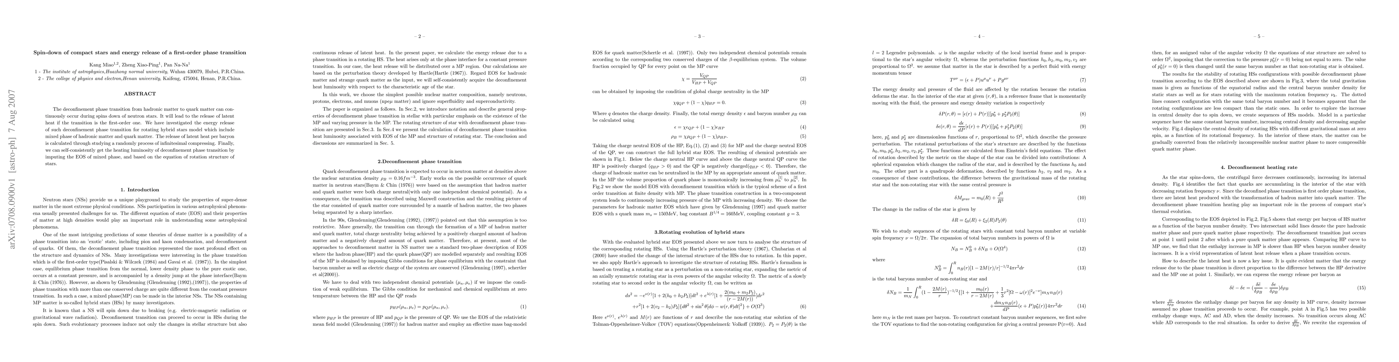 This paper investigates the energy release during the spin-down of neutron stars due to a first-order phase transition from hadronic to quark matter, calculating the latent heat per baryon and deriving the heating luminosity for rotating hybrid stars using the equation of state for mixed phases and rotational structure.