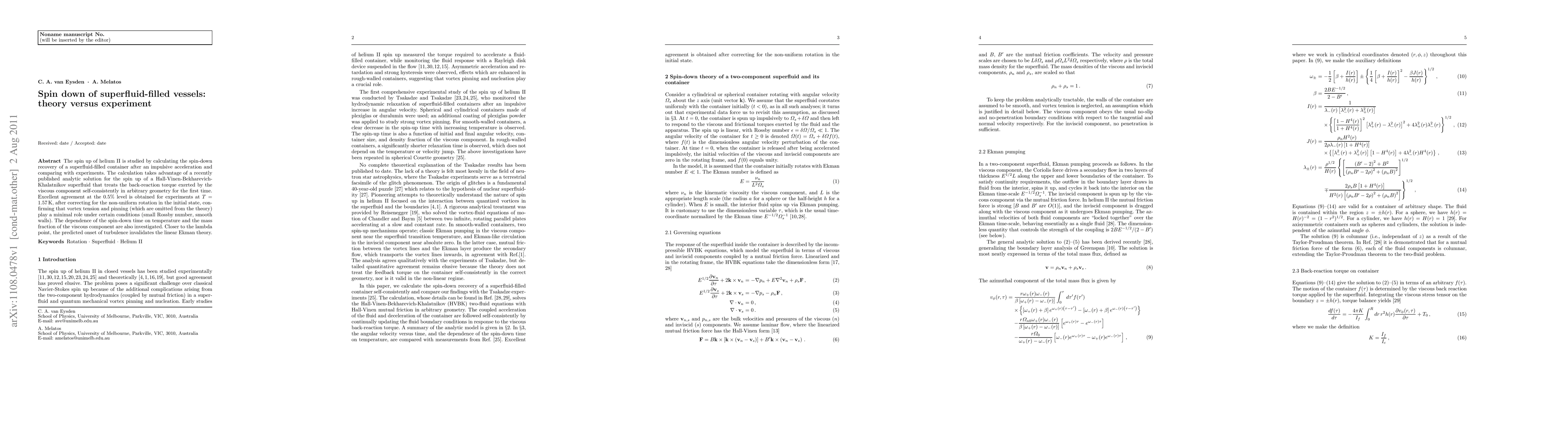 This paper compares theoretical predictions of the spin-down recovery of superfluid helium II in a container with experimental results, showing excellent agreement at the 0.5% level. The theory accounts for the back-reaction torque of the viscous component, and the results suggest vortex tension and pinning play minimal roles under specific conditions.