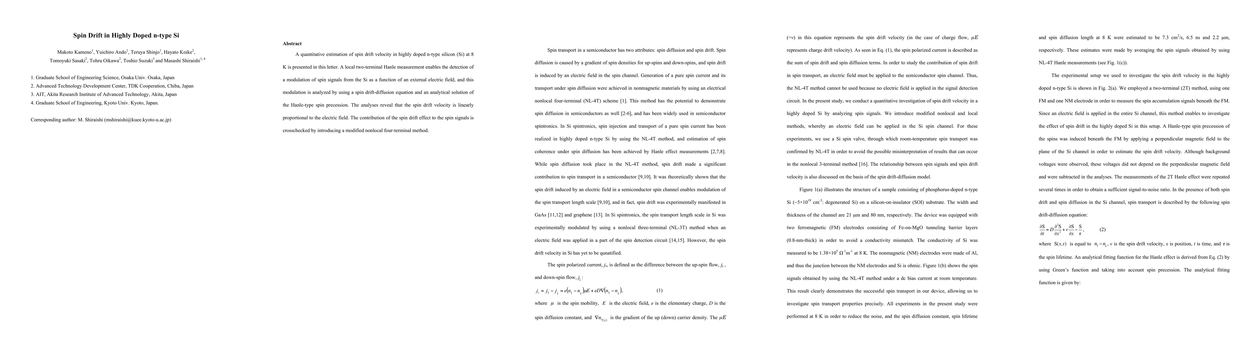 This paper quantitatively estimates spin drift velocity in highly doped n-type silicon at 8 K, revealing a linear proportionality to the external electric field through Hanle measurements and a spin drift-diffusion equation. The findings are corroborated using a modified nonlocal four-terminal method.