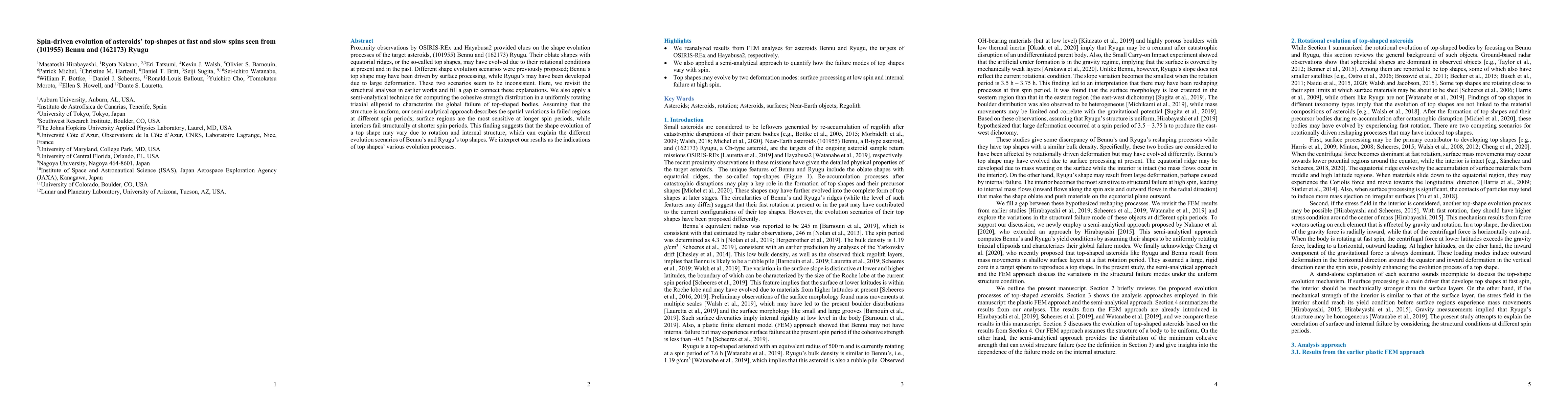 Proximity observations by OSIRIS-REx and Hayabusa2 provided clues on the shape evolution processes of the target asteroids, (101955) Bennu and (162173) Ryugu. Their oblate shapes with equatorial ridges, or the so-called top shapes, may have evolved due to their rotational conditions at present and in the past. Different shape evolution scenarios were previously proposed; Bennu's top shape may have been driven by surface processing, while Ryugu's may have been developed due to large deformation. These two scenarios seem to be inconsistent. Here, we revisit the structural analyses in earlier works and fill a gap to connect these explanations. We also apply a semi-analytical technique for computing the cohesive strength distribution in a uniformly rotating triaxial ellipsoid to characterize the global failure of top-shaped bodies. Assuming that the structure is uniform, our semi-analytical approach describes the spatial variations in failed regions at different spin periods; surface regions are the most sensitive at longer spin periods, while interiors fail structurally at shorter spin periods. This finding suggests that the shape evolution of a top shape may vary due to rotation and internal structure, which can explain the different evolution scenarios of Bennu's and Ryugu's top shapes. We interpret our results as the indications of top shapes' various evolution processes.