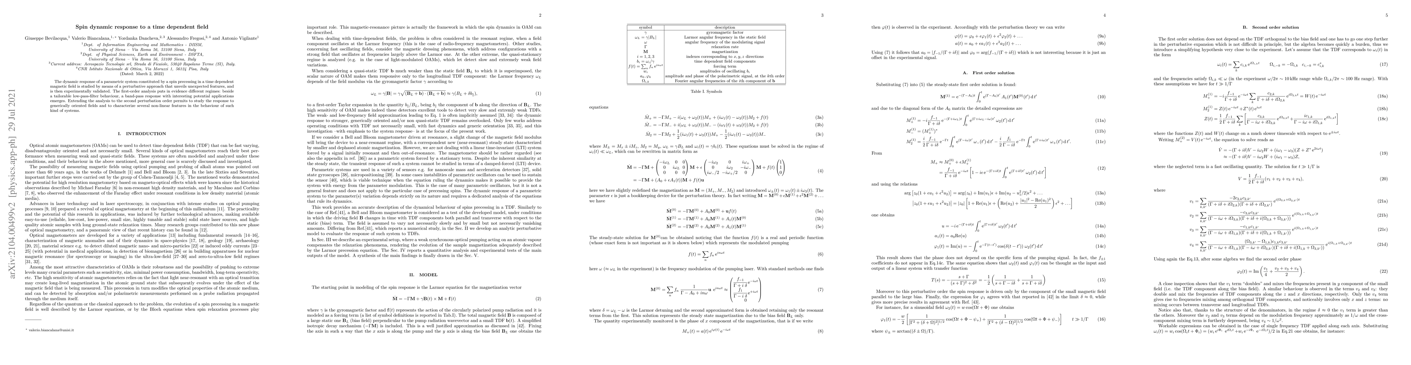 The dynamic response of a parametric system constituted by a spin precessing in a time dependent magnetic field is studied by means of a perturbative approach that unveils unexpected features, and is then experimentally validated. The first-order analysis puts in evidence different regimes: beside a tailorable low-pass-filter behaviour, a band-pass response with interesting potential applications emerges. Extending the analysis to the second perturbation order permits to study the response to generically oriented fields and to characterize several non-linear features in the behaviour of such kind of systems.