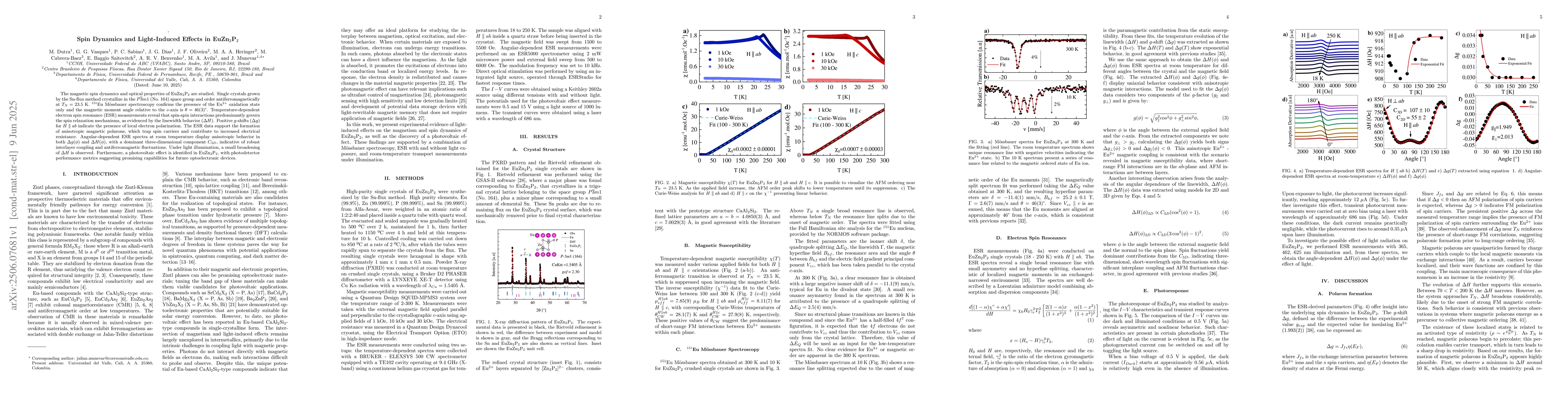 This study investigates the magnetic spin dynamics and optical properties of EuZn$_2$P$_2$, revealing anisotropic magnetic polarons that trap spin carriers and a photovoltaic effect under light illumination with promising optoelectronic capabilities.
