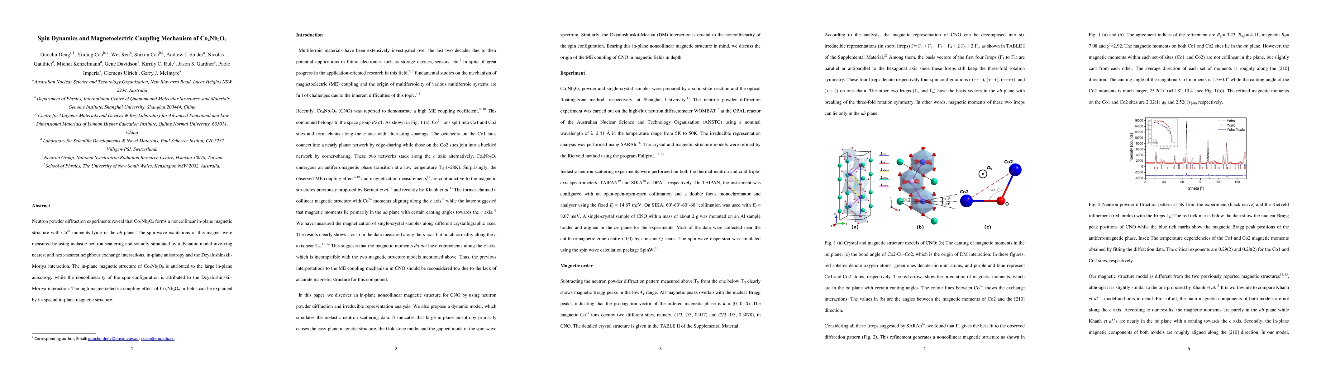 This paper reveals that Co4Nb2O9 has a noncollinear in-plane magnetic structure, attributed to its large anisotropy and Dzyaloshinskii-Moriya interaction, with high magnetoelectric coupling effects observed.