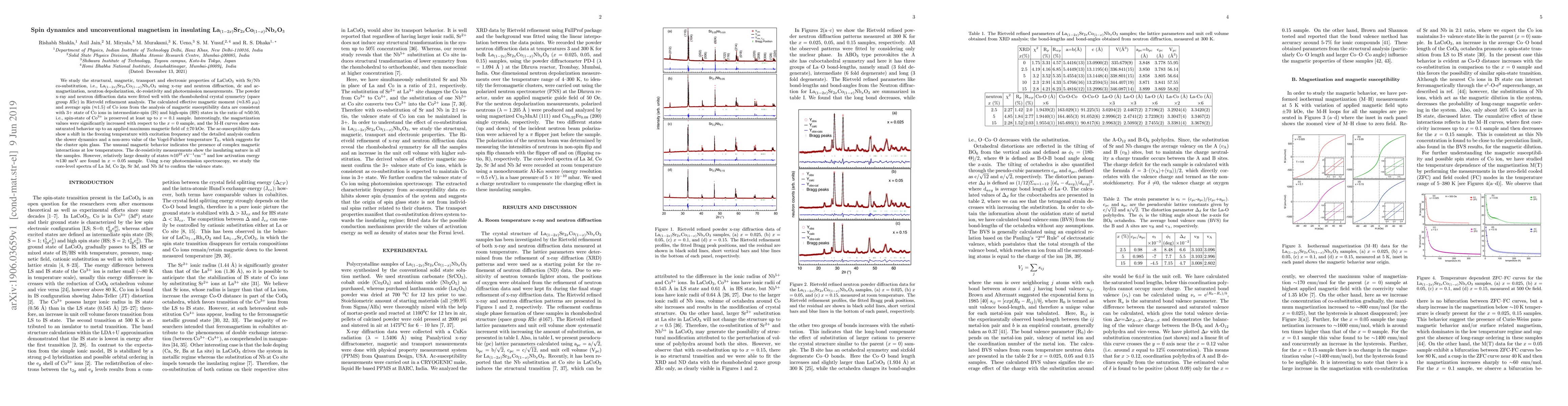 This paper investigates the structural, magnetic, transport, and electronic properties of La$_{(1-2x)}$Sr$_{2x}$Co$_{(1-x)}$Nb$_{x}$O$_3$ using various experimental techniques. The study reveals complex magnetic interactions, unconventional magnetism, and insulating behavior in the material.
