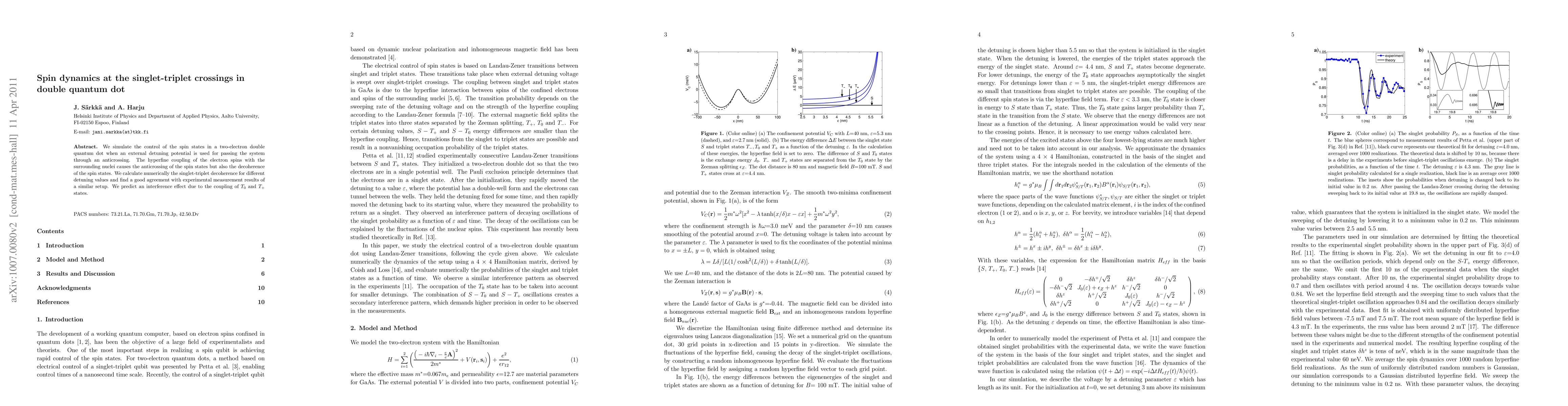 This paper investigates the spin dynamics in a double quantum dot system as it transitions through singlet-triplet anticrossings under an external detuning potential. The study numerically analyzes the decoherence effects due to hyperfine coupling and predicts an interference effect from the coupling of T0 and T+ states, showing good agreement with experimental results.