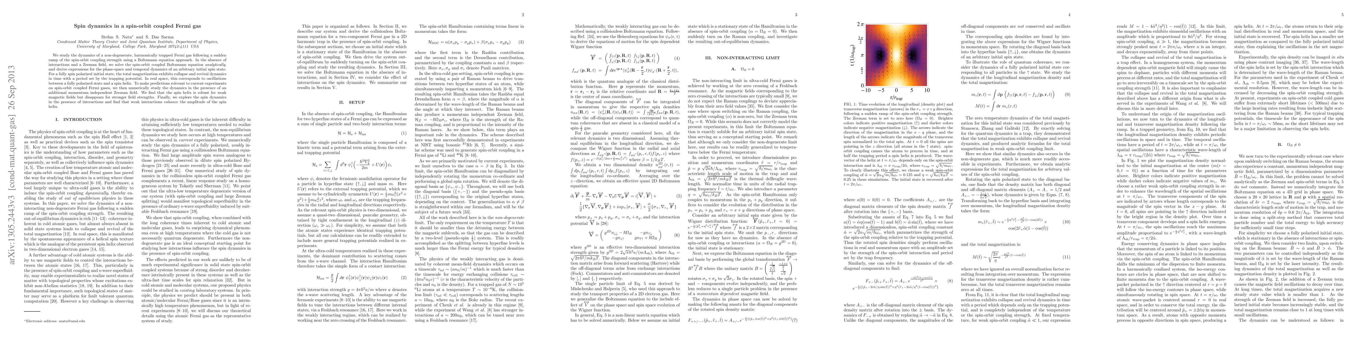 The paper investigates spin dynamics in a spin-orbit coupled Fermi gas after a rapid change in coupling strength, using analytical and numerical methods. Key findings include collapse and revival of total magnetization with trapping periodicity, and real-space oscillations between polarized states and spin helixes. Interactions' effects are studied via a collisionless Boltzmann equation.