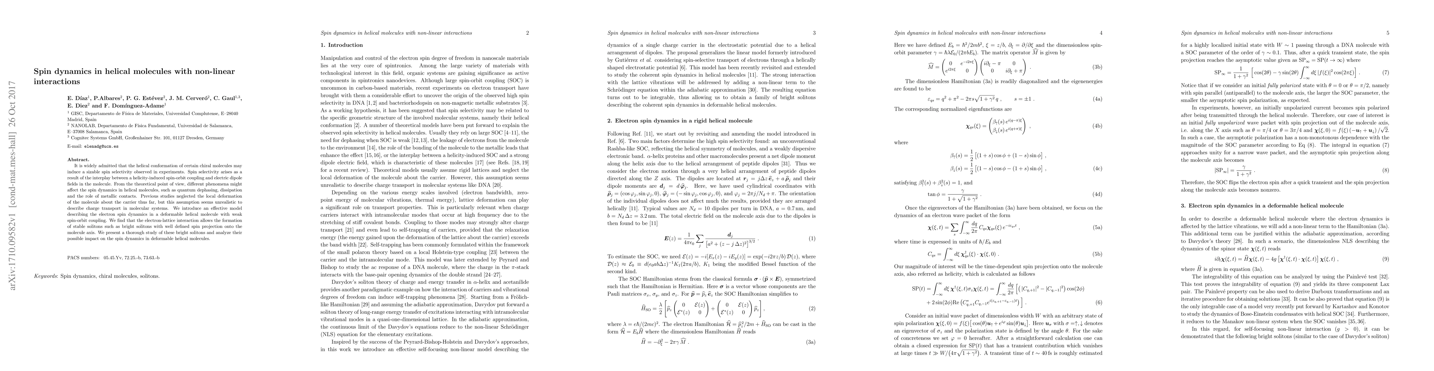 This paper explores the spin dynamics in helical molecules with non-linear interactions, introducing a model that accounts for electron-lattice interactions. It finds that these interactions can lead to the formation of stable solitons, which may significantly influence spin dynamics in deformable helical molecules.