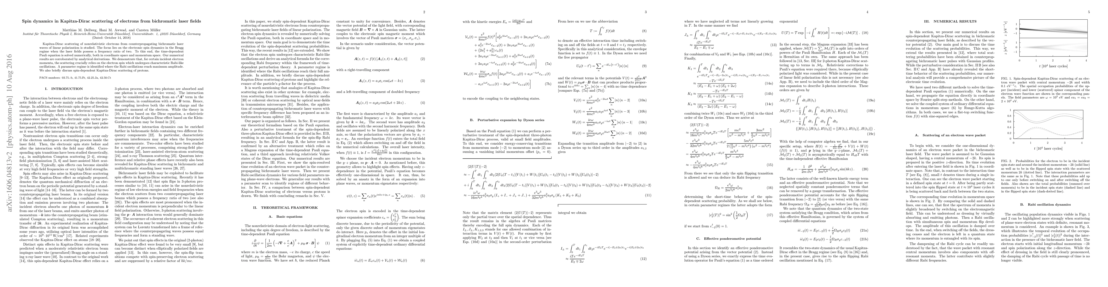 This paper investigates the spin dynamics of electrons undergoing Kapitza-Dirac scattering from bichromatic laser fields in the Bragg regime. Numerical solutions of the time-dependent Pauli equation reveal that electron spin plays a crucial role, leading to Rabi-like oscillations, with a specific parameter regime maximizing these oscillations.
