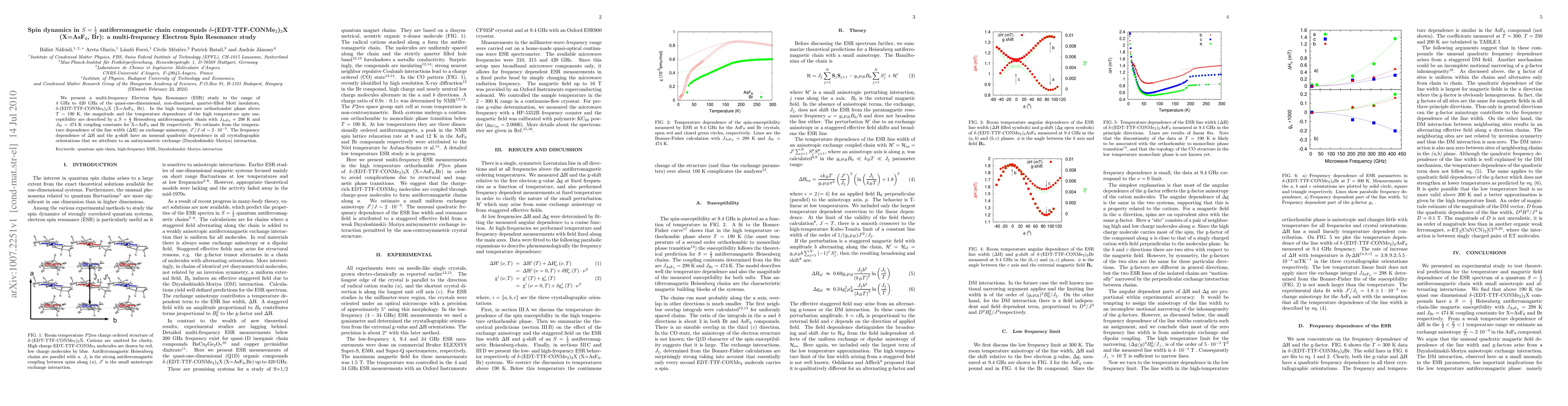 We present a multi-frequency Electron Spin Resonance (ESR) study in the range of 4 GHz to 420 GHz of the quasi-one-dimensional, non-dimerized, quarter-filled Mott insulators, delta-(EDT-TTF-CONMe_2)_2X (X=AsF_6, Br). In the high temperature orthorhombic phase above T~190 K, the magnitude and the temperature dependence of the high temperature spin susceptibility are described by a S = 1/2 Heisenberg antiferromagnetic chain with J_AsF6=298 K and J_Br=474 K coupling constants for X=AsF_6 and Br respectively. We estimate from the temperature dependence of the line width an exchange anisotropy, J'/J of ~2 * 10^{-3}. The frequency dependence of the line width and the g-shift have an unusual quadratic dependence in all crystallographic orientations that we attribute to an antisymmetric exchange (Dzyaloshinskii--Moriya) interaction.