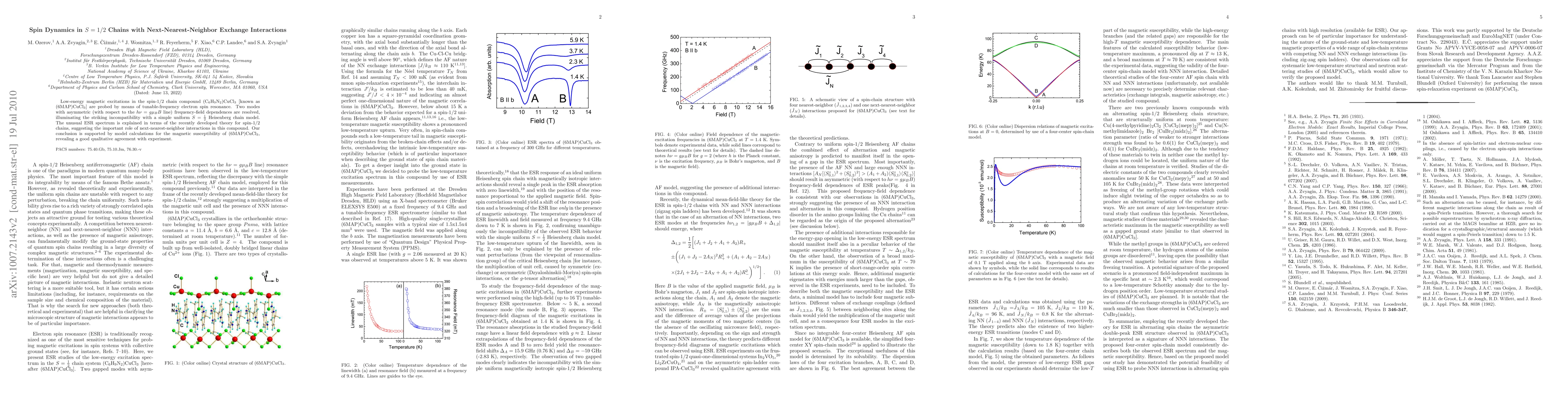 This study investigates low-energy magnetic excitations in the spin-1/2 chain compound (6MAP)CuCl$_3$ using tunable-frequency electron spin resonance, revealing two asymmetric modes that challenge the simple Heisenberg model. The findings suggest significant next-nearest-neighbor interactions, supported by model calculations matching experimental magnetic susceptibility.