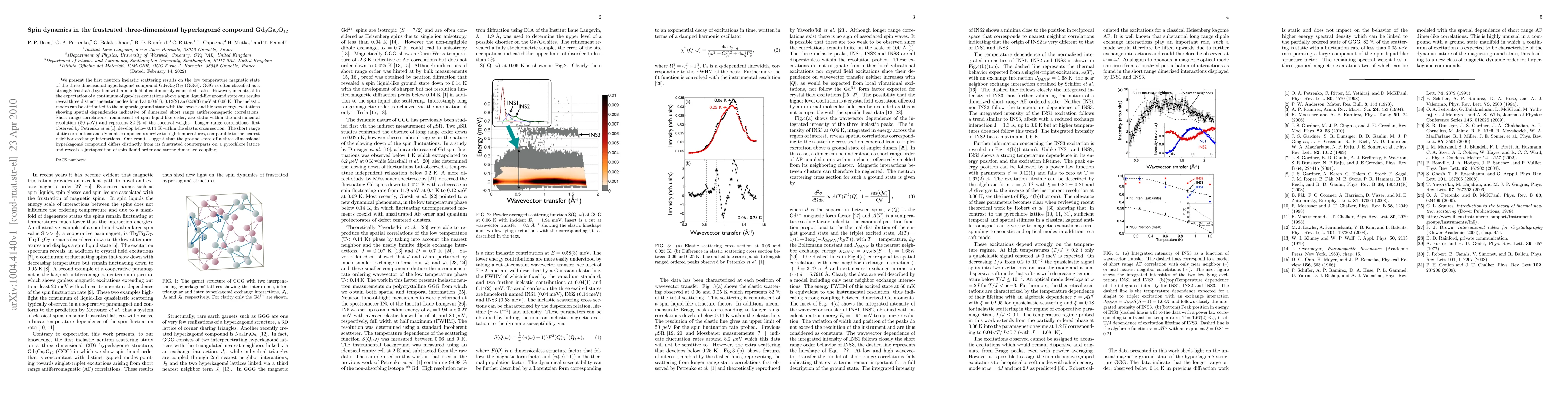 We present the first neutron inelastic scattering results on the low temperature magnetic state of the three dimensional hyperkagom\'e compound Gd$_{3}$Ga$_{5}$O$_{12}$ (GGG). GGG is often classified as a strongly frustrated system with a manifold of continuously connected states. However, in contrast to the expectation of a continuum of gap-less excitations above a spin liquid-like ground state our results reveal three distinct inelastic modes found at 0.04(1), 0.12(2) an 0.58(3) meV at 0.06 K. The inelastic modes can be attributed to the magnetic ground state with the lowest and highest energy excitations showing spatial dependencies indicative of dimerized short range antiferromagnetic correlations. Short range correlations, reminiscent of spin liquid-like order, are static within the instrumental resolution (50 $\mu$eV) and represent 82% of the spectral weight. Longer range correlations, first observed by Petrenko, et al.\cite{Petrenko1998, develop below 0.14 ~K within the elastic cross section. The short range static correlations and dynamic components survive to high temperatures, comparable to the nearest neighbor exchange interactions. Our results suggest that the ground state of a three dimensional hyperkagom\'e compound differs distinctly from its frustrated counterparts on a pyrochlore lattice and reveals a juxtaposition of spin liquid order and strong dimerised coupling.