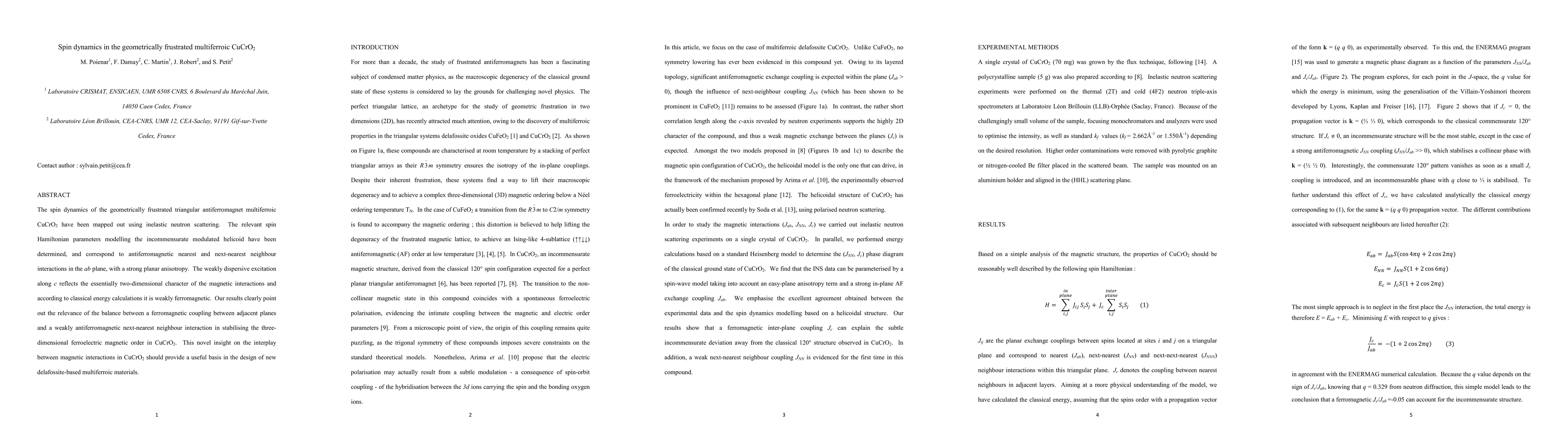 The spin dynamics of the geometrically frustrated triangular antiferromagnet multiferroic CuCrO2 have been mapped out using inelastic neutron scattering. The relevant spin Hamiltonian parameters modelling the incommensurate modulated helicoid have been determined, and correspond to antiferromagnetic nearest and next-nearest neighbour interactions in the ab plane, with a strong planar anisotropy. The weakly dispersive excitation along c reflects the essentially two-dimensional character of the magnetic interactions and according to classical energy calculations it is weakly ferromagnetic. Our results clearly point out the relevance of the balance between a ferromagnetic coupling between adjacent planes and a weakly antiferromagnetic next-nearest neighbour interaction in stabilising the three-dimensional ferroelectric magnetic order in CuCrO2. This novel insight on the interplay between magnetic interactions in CuCrO2 should provide a useful basis in the design of new delafossite-based multiferroic materials.