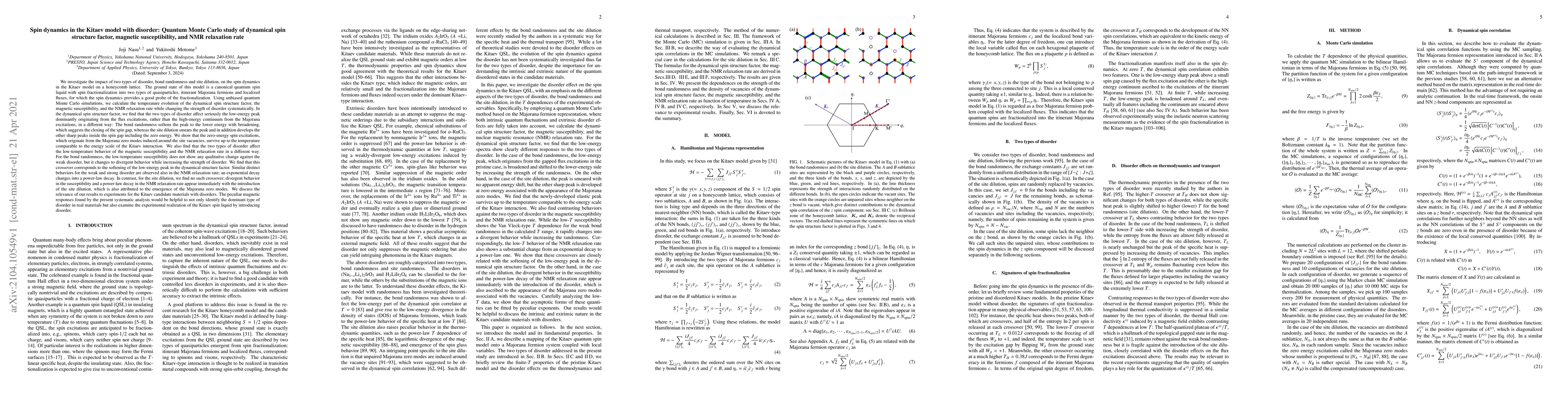 This study uses quantum Monte Carlo simulations to explore how bond randomness and site dilution affect spin dynamics in the Kitaev model, revealing distinct impacts on the dynamical spin structure factor, magnetic susceptibility, and NMR relaxation rate. The results show that bond randomness softens and broadens the low-energy spin excitation peak, while site dilution smears the peak and introduces sharp peaks within the spin gap, including zero-energy modes.