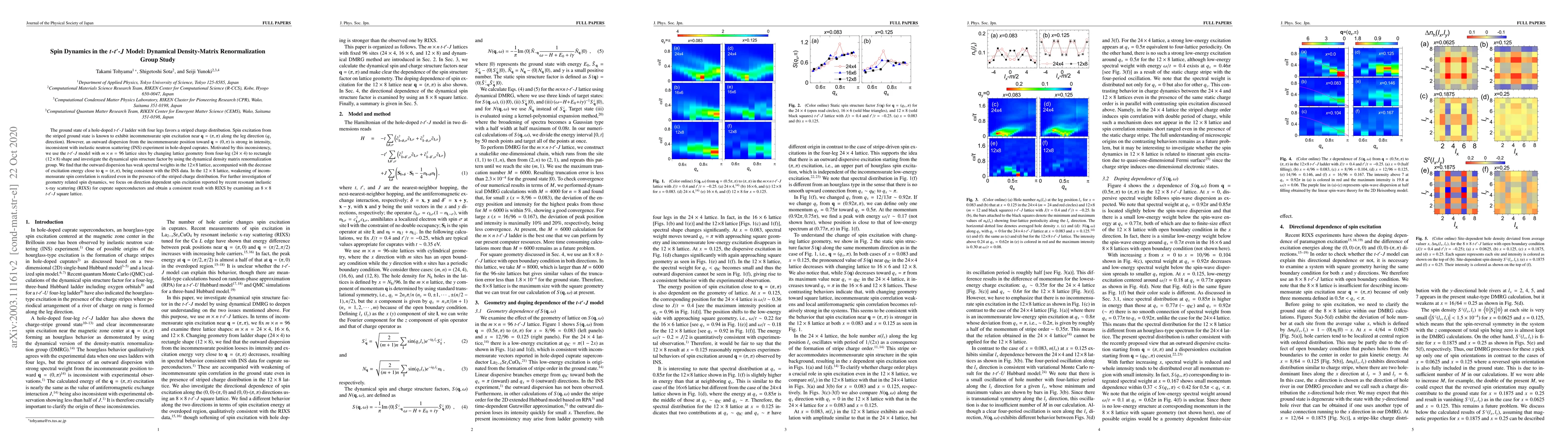 This paper investigates spin dynamics in the t-t'-J model using dynamical density-matrix renormalization group, focusing on lattice geometry effects. It finds that changing from a four-leg to a rectangular lattice reduces the outward dispersion of spin excitations, aligning with inelastic neutron scattering data and resonant inelastic x-ray scattering results for cuprate superconductors.
